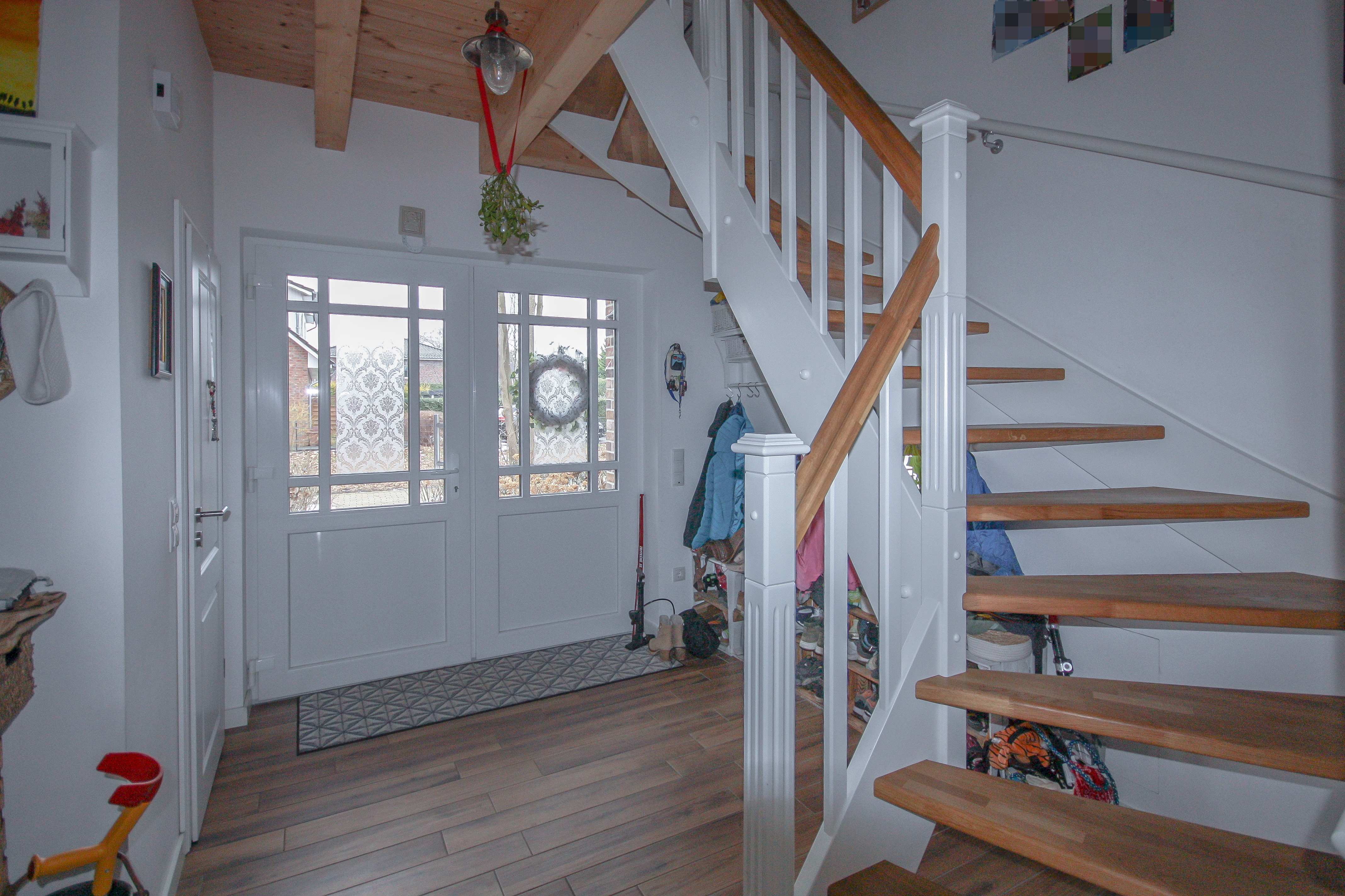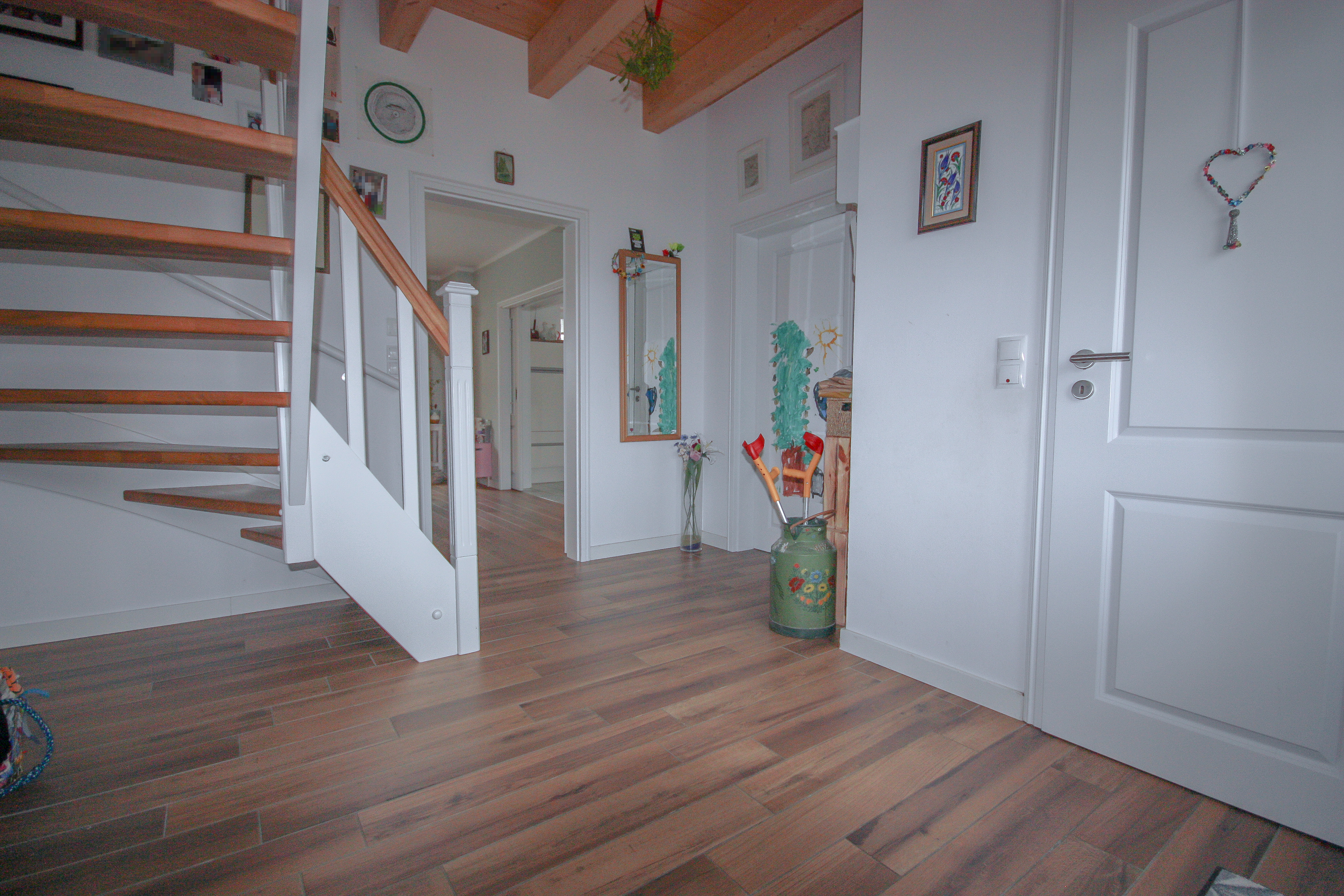 Beim Betreten des Hauses empfängt Sie ein großzügiger Eingangsbereich mit viel Platz für eine Garderobe. Besonders charmant wirken die offenen Holzbalken, die dem Haus von Beginn an eine warme, gemütliche Atmosphäre verleihen.