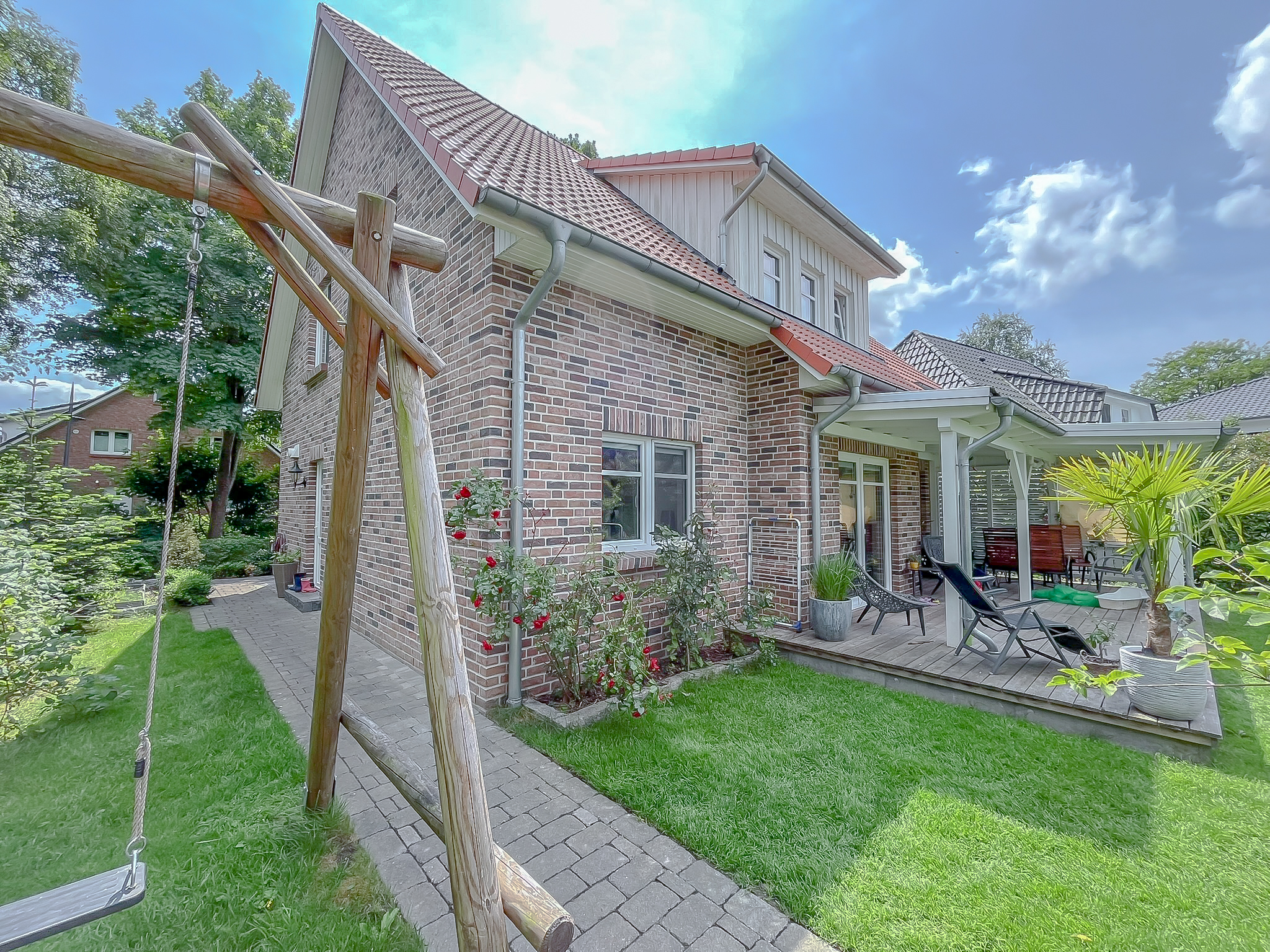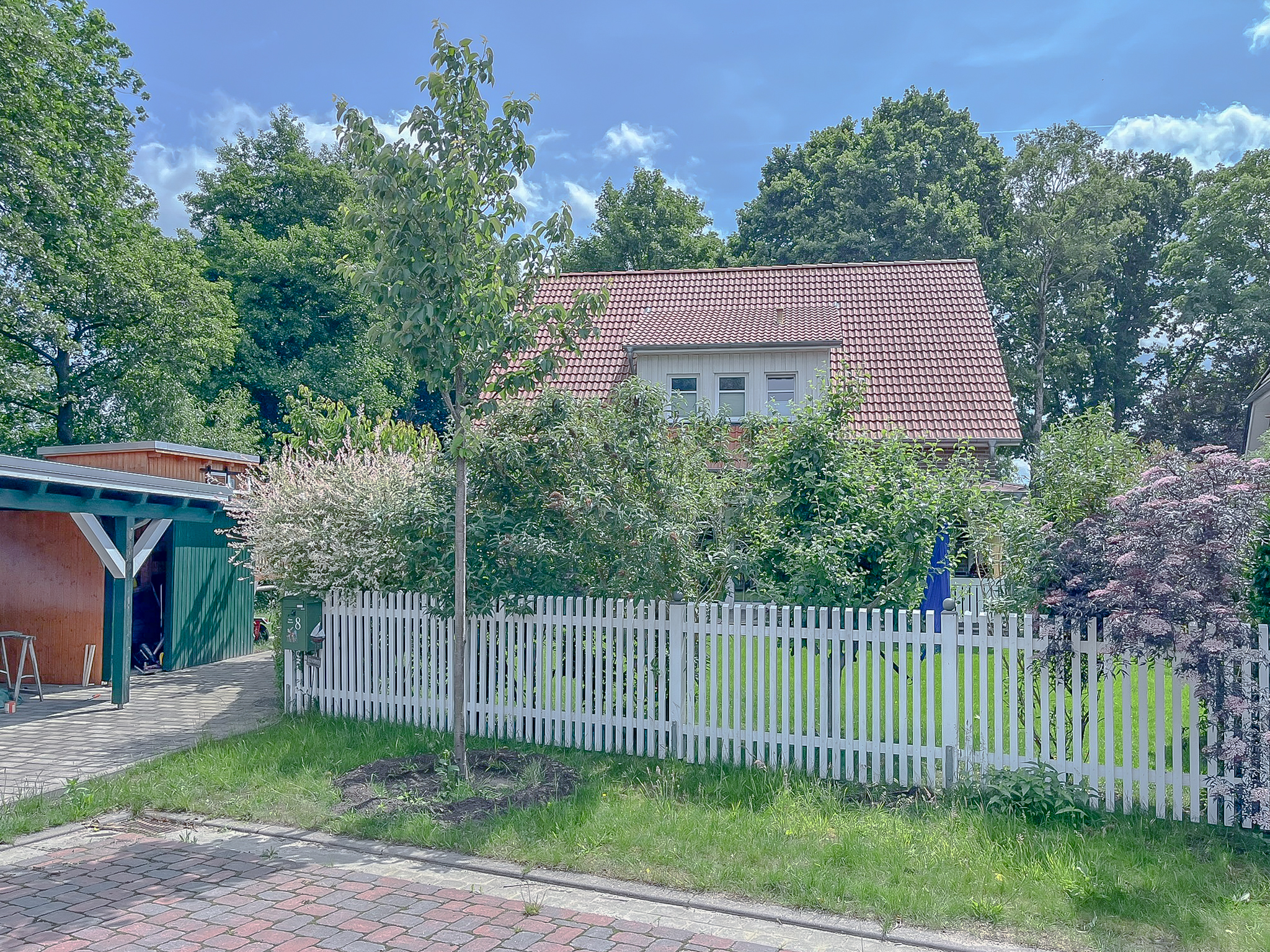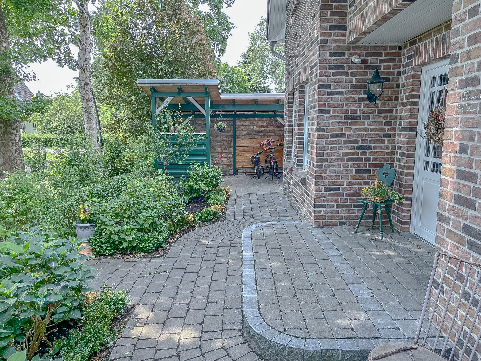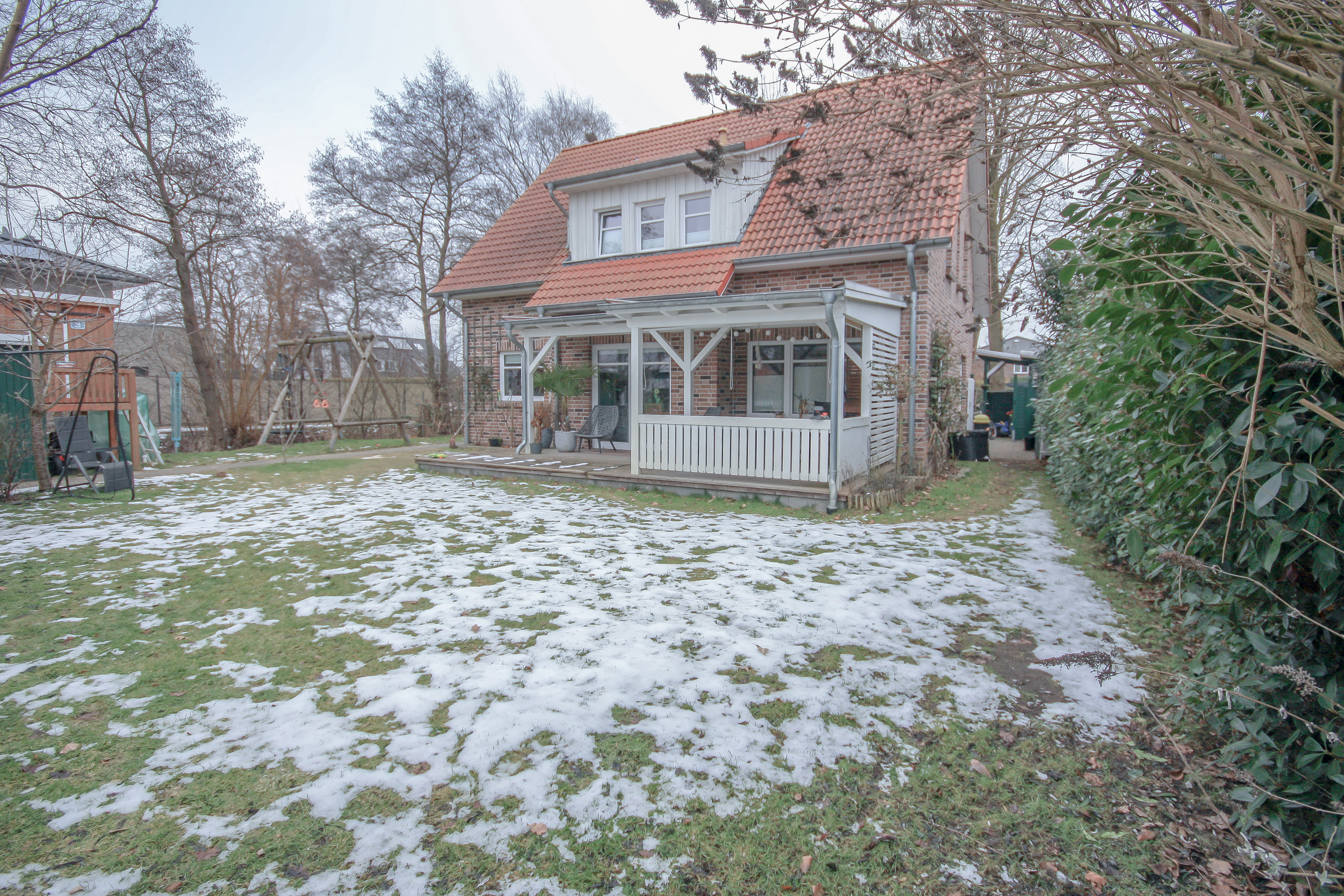 Der Außenbereich des Hauses wurde liebevoll und durchdacht angelegt und präsentiert sich ebenso gepflegt wie die gesamte Immobilie. Der Garten ist ansprechend bepflanzt und bietet durch seine Gestaltung eine uneingeschränkte Privatsphäre. Ein besonderes Highlight ist die überdachte Holzveranda, die zu gemütlichen und entspannten Stunden im Freien einlädt. Der Garten profitiert zudem von einer sonnigen Ausrichtung und bietet bis in die Abendstunden angenehme Sonne. Das Haus liegt eingebettet zwischen zwei Grünstreifen mit altem Baumbestand, sodass es nur zu einer Seite einen direkten Nachbarn gibt. Dadurch entsteht ein besonders hohes Maß an Ruhe und Privatsphäre. Ein Kinderspielhaus steht neben einem praktischen Schuppen ebenfalls zur Verfügung.