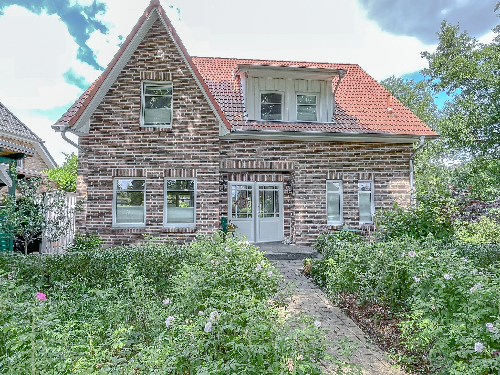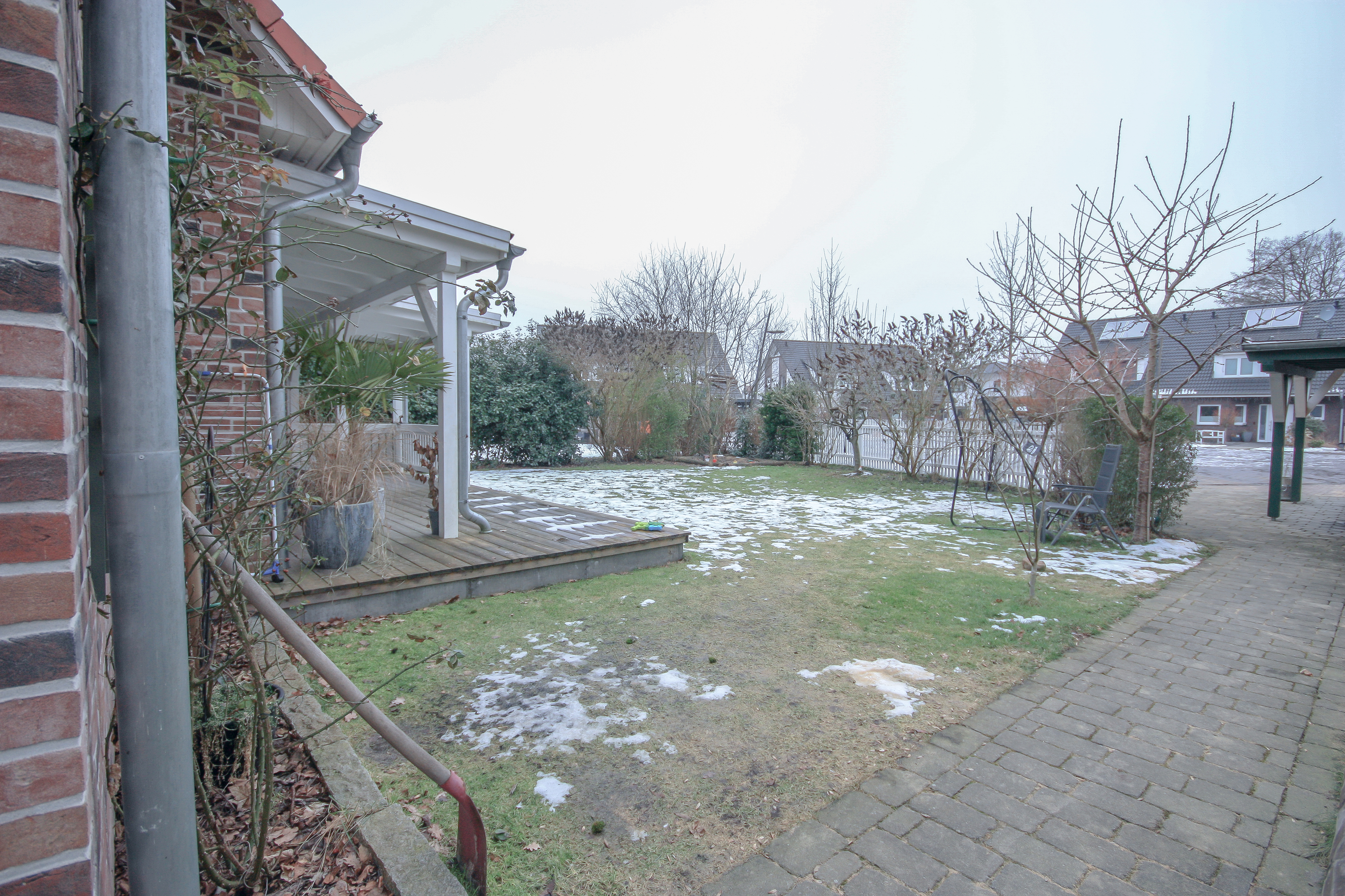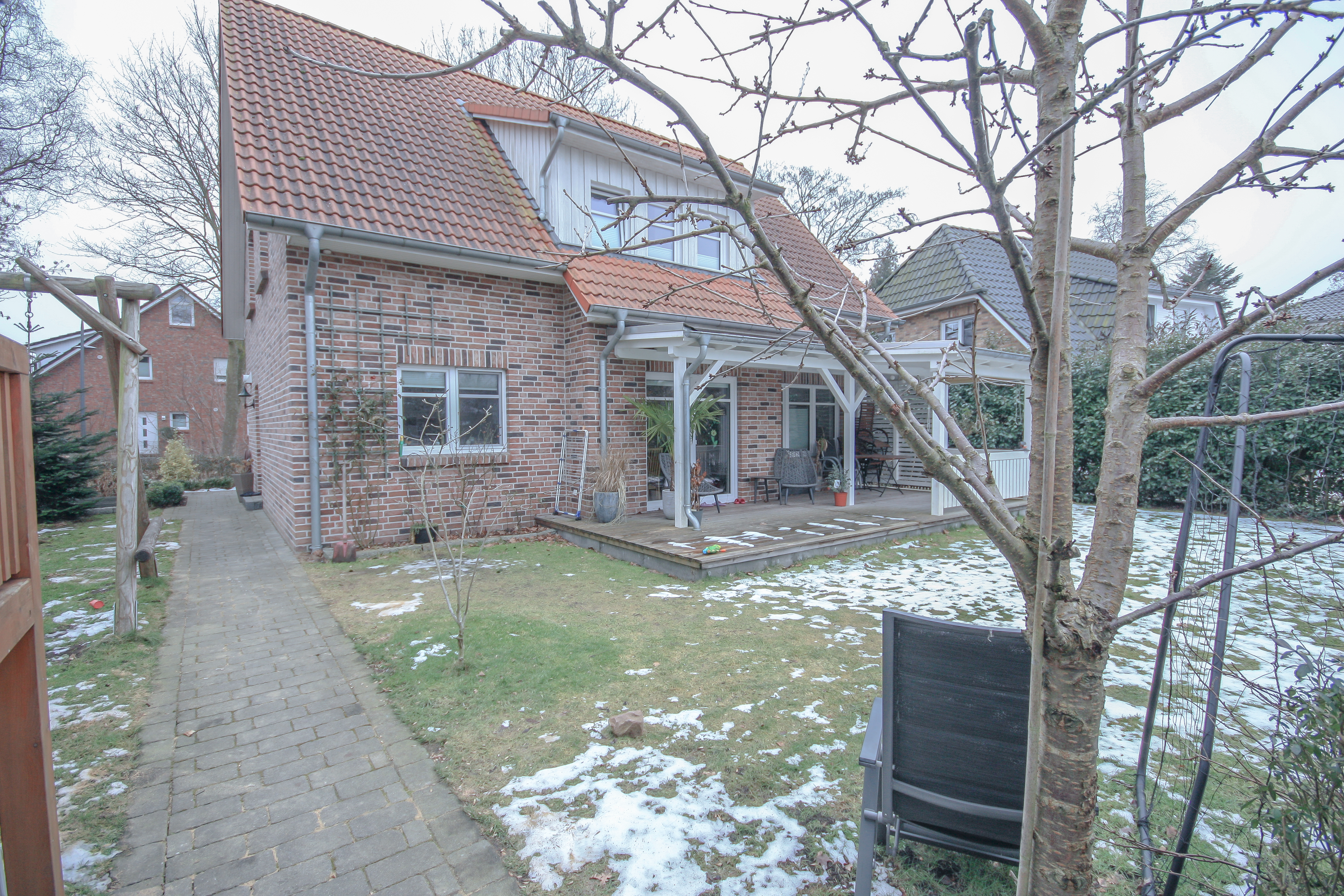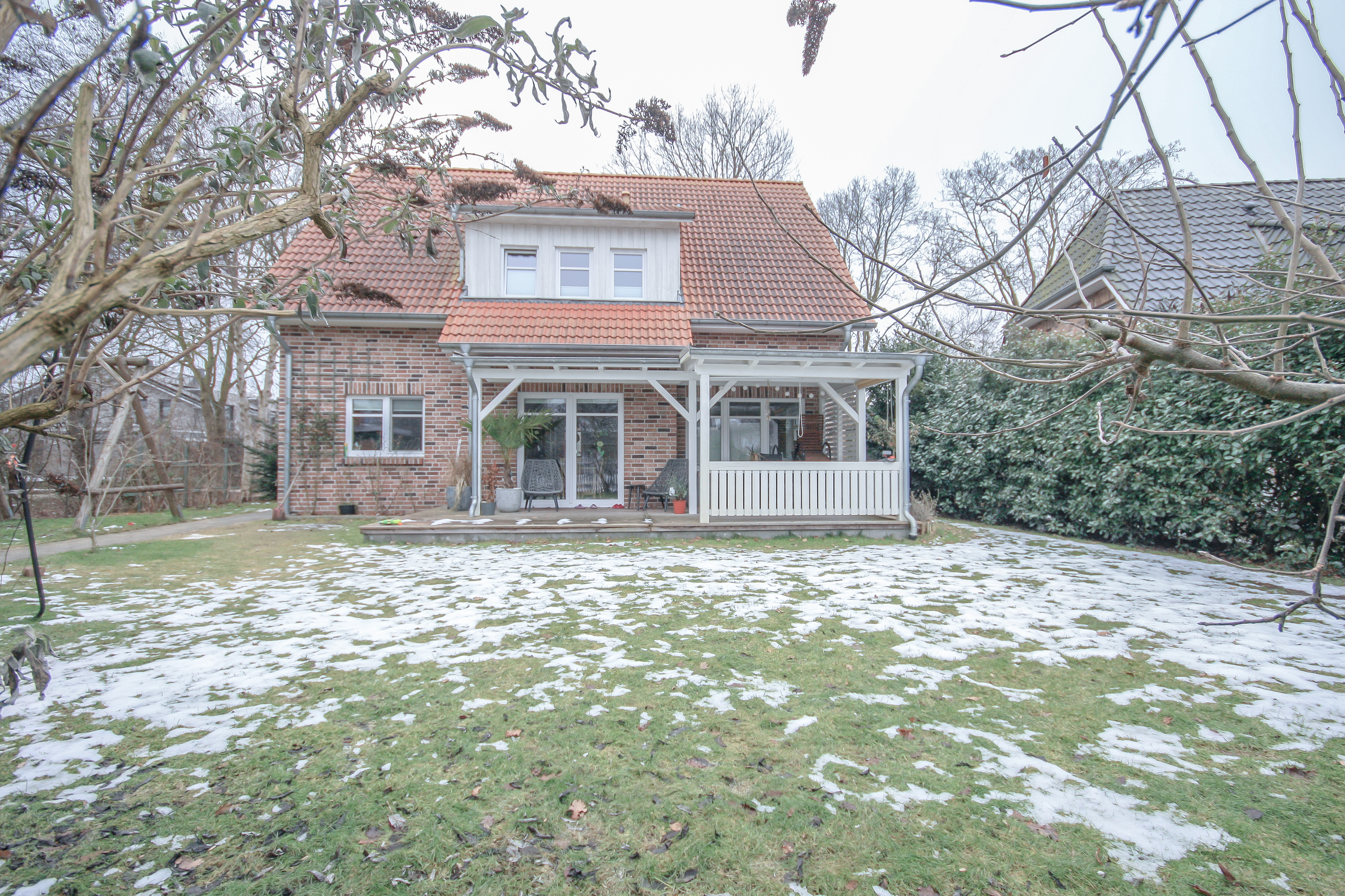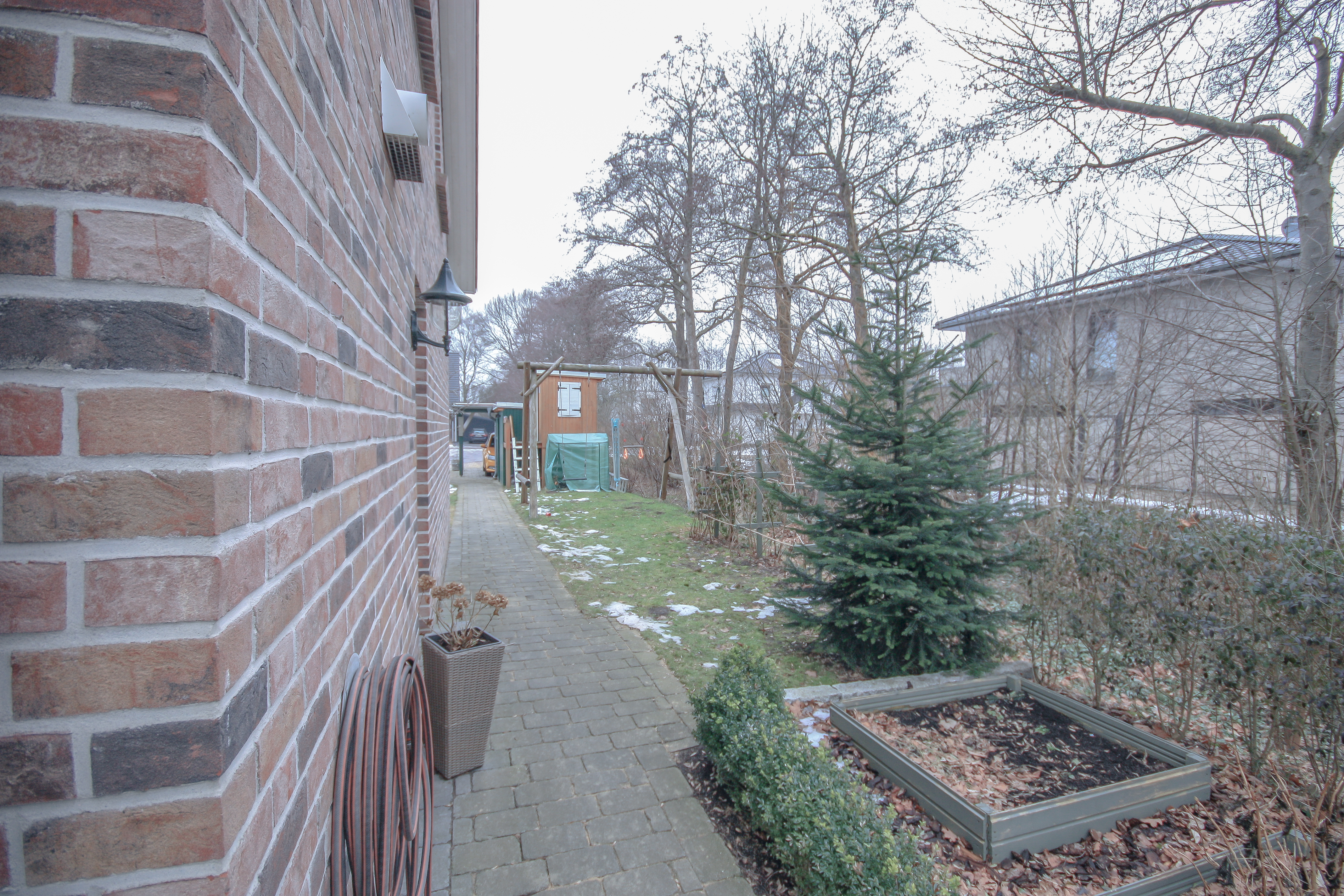 Der Außenbereich des Hauses wurde liebevoll und durchdacht angelegt und präsentiert sich ebenso gepflegt wie die gesamte Immobilie. Der Garten ist ansprechend bepflanzt und bietet durch seine Gestaltung eine uneingeschränkte Privatsphäre. Ein besonderes Highlight ist die überdachte Holzveranda, die zu gemütlichen und entspannten Stunden im Freien einlädt. Der Garten profitiert zudem von einer sonnigen Ausrichtung und bietet bis in die Abendstunden angenehme Sonne. Das Haus liegt eingebettet zwischen zwei Grünstreifen mit altem Baumbestand, sodass es nur zu einer Seite einen direkten Nachbarn gibt. Dadurch entsteht ein besonders hohes Maß an Ruhe und Privatsphäre. Ein Kinderspielhaus steht neben einem praktischen Schuppen ebenfalls zur Verfügung.
