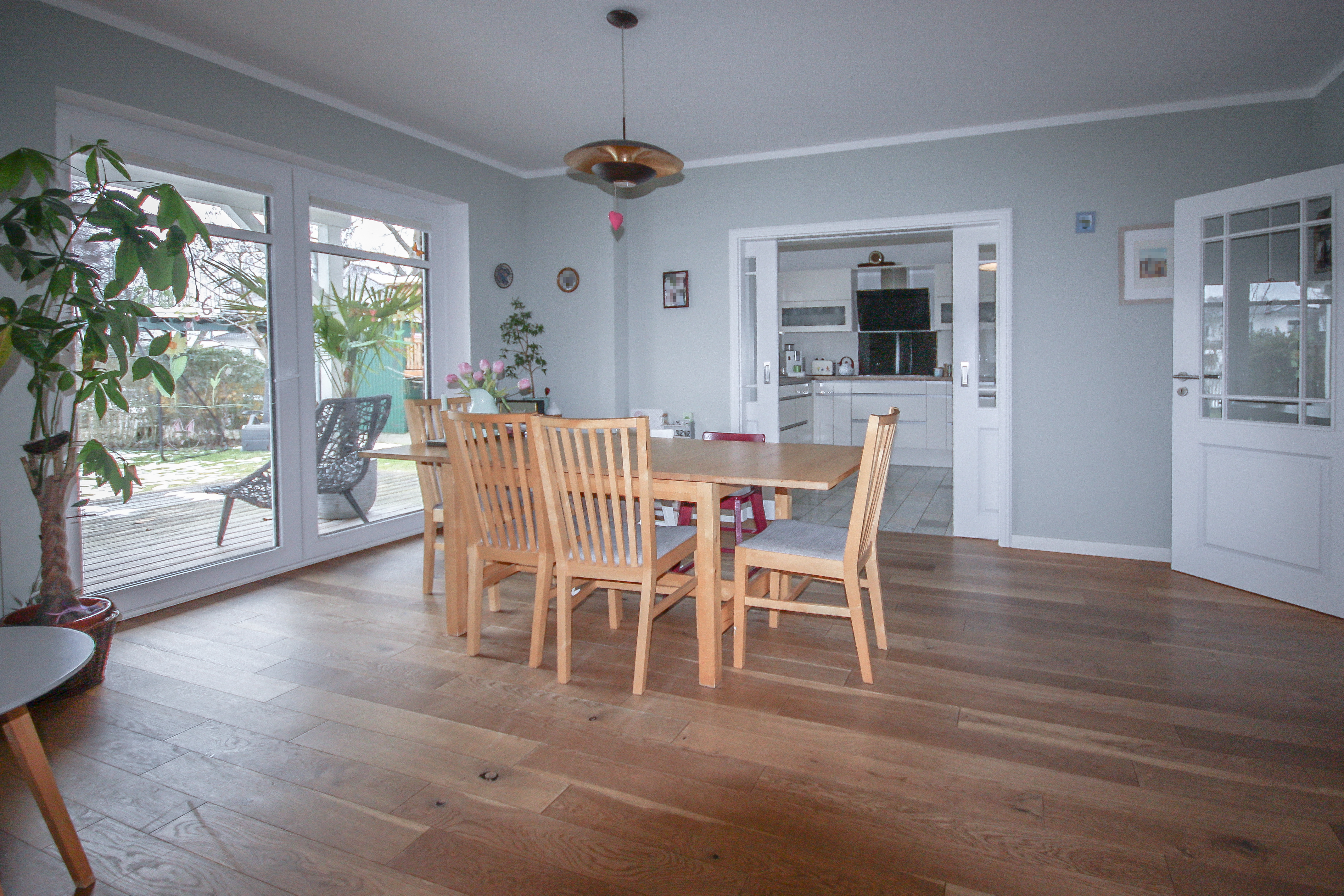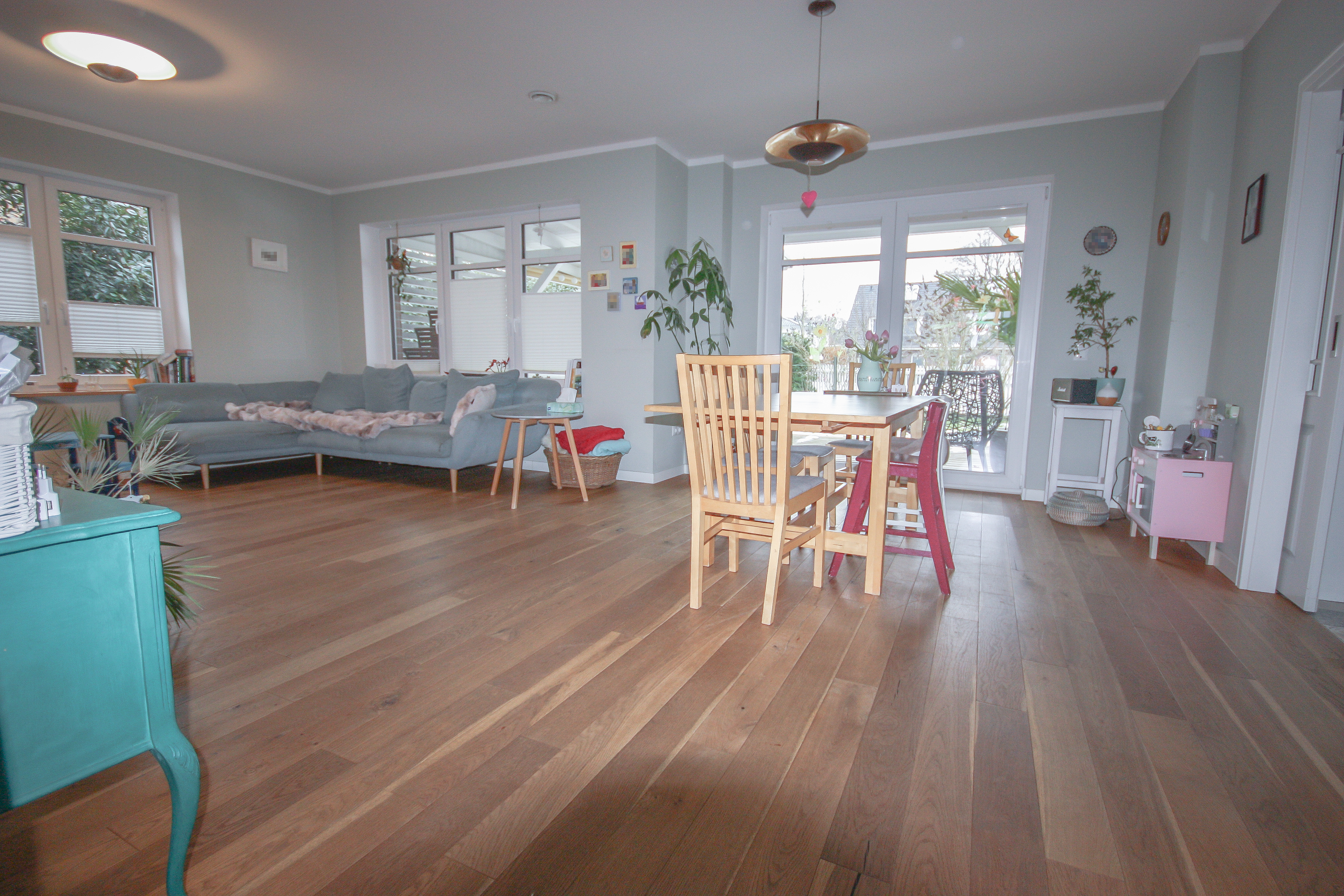 Der Wohn- und Essbereich ist dank der zahlreichen Fenster lichtdurchflutet und vermittelt ein offenes, freundliches Wohngefühl. Der großzügige und vorteilhafte Grundriss bietet ausreichend Platz für eine große Esstafel sowie einen gemütlichen Wohnbereich mit vielfältigen Stellmöglichkeiten.