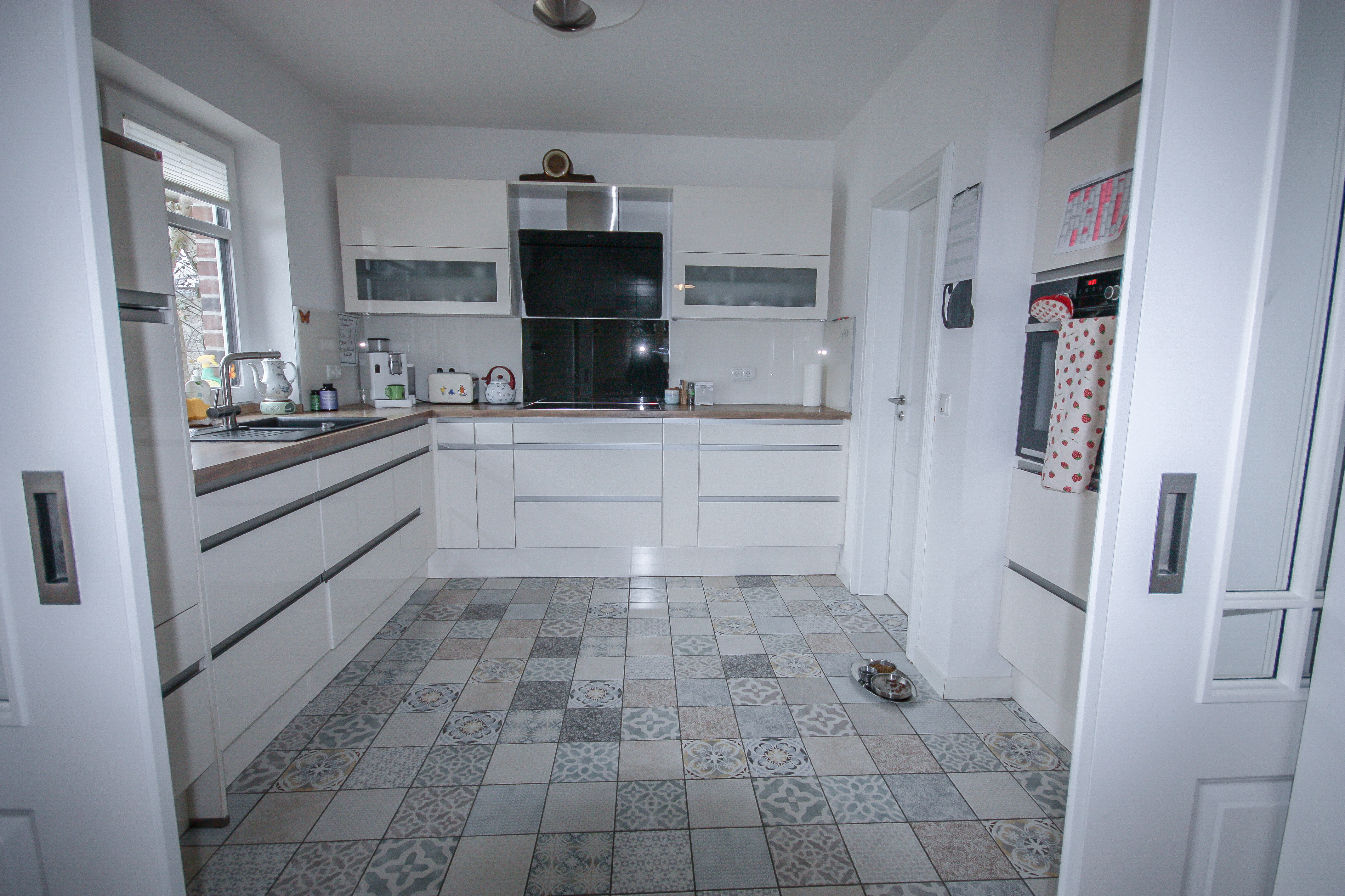 Das Wohnzimmer besticht durch seinen hervorragenden Schnitt und die vielfältigen Nutzungsmöglichkeiten. Über eine Schiebetür lässt sich die großzügige Küche vom Essbereich separieren. Die Küche ist hochwertig ausgestattet, bietet jeglichen Komfort. Ein besonderes Highlight ist der schöne Blick in den Garten, der den Küchenbereich zusätzlich aufwertet. Direkt angrenzend befindet sich ein praktischer Vorratsraum, der kurze Wege und zusätzlichen Stauraum bietet.