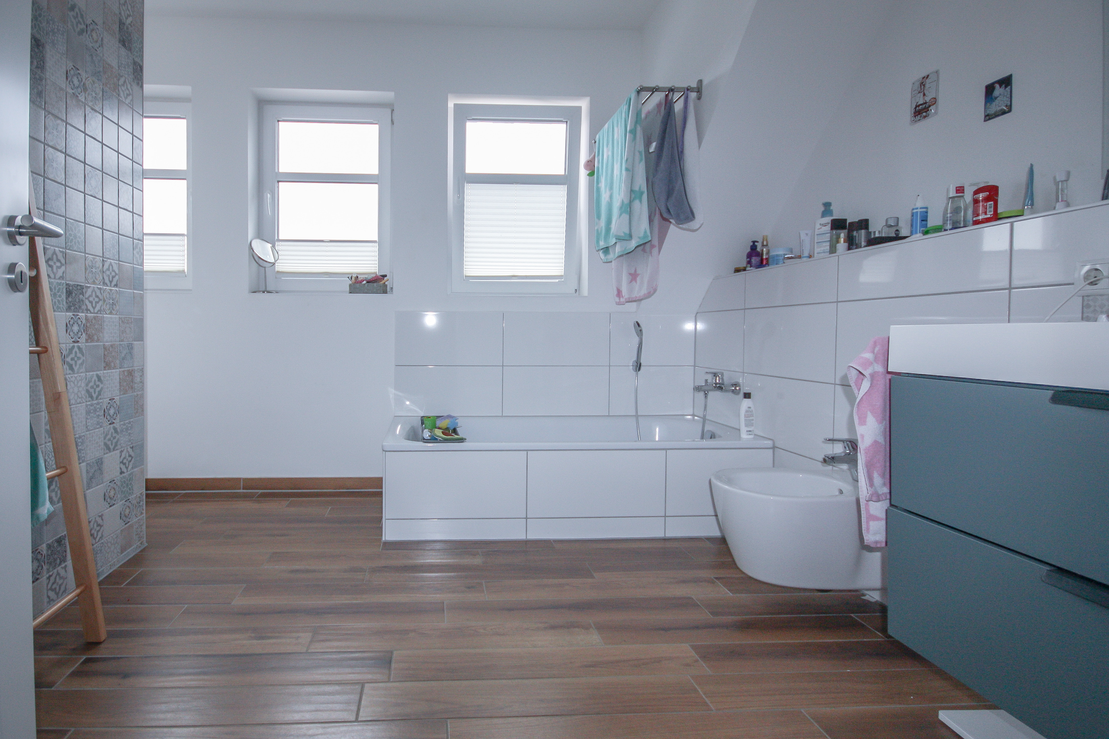 Das Badezimmer im Obergeschoss präsentiert sich großzügig gestaltet und überzeugt durch eine hochwertige Ausstattung sowie eine angenehme, helle Atmosphäre. Eine stilvoll geflieste Walk-In-Dusche ohne Glaselemente unterstreicht die moderne Gestaltung, während drei Fenster für reichlich Tageslicht sorgen. Ergänzt wird die Ausstattung durch eine komfortable Badewanne sowie ein Bidet.