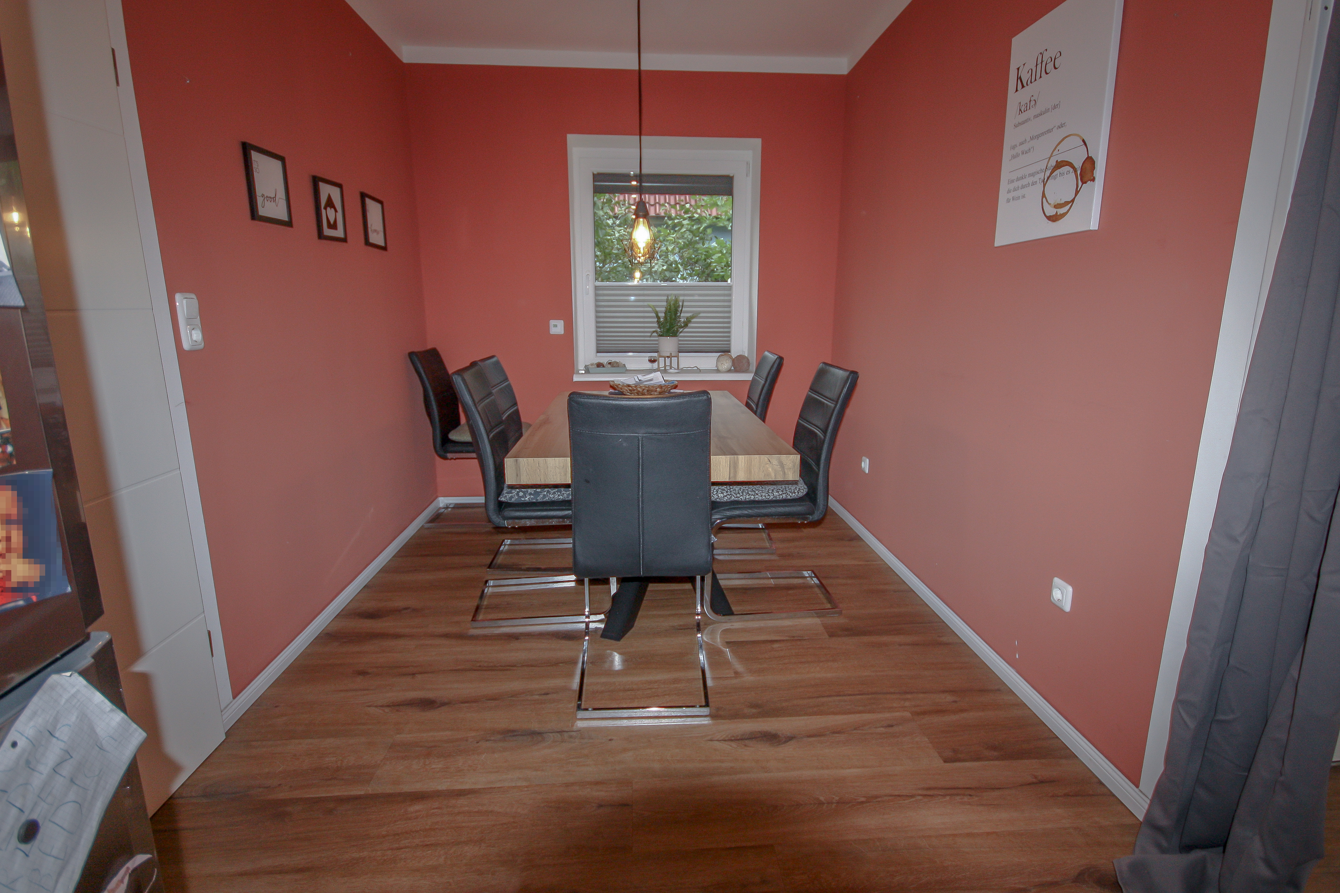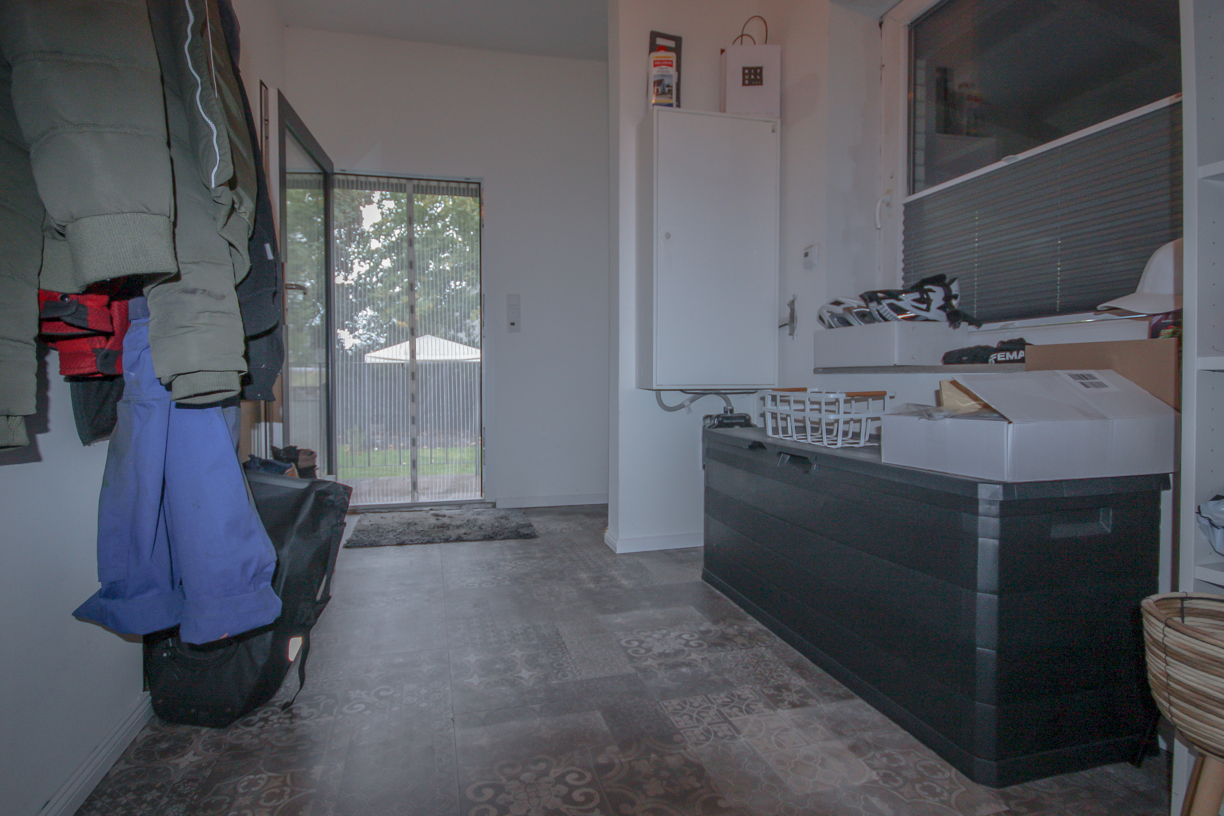 Bereits beim Betreten des Hauses empfängt Sie ein großzügiger Eingangsbereich, der einen freundlichen und offenen ersten Eindruck vermittelt. Hier findet sich reichlich Platz für eine große Garderobe und Stauraum. Von hier aus gelangen Sie links in die große, moderne Küche, die mit einer neuen Einbauküche ausgestattet ist und ausreichend Raum für einen großen Esstisch bietet. Angrenzend befindet sich ein praktischer Vorratsraum, in dem sich auch die Heizungsanlage befindet. Ein weiterer Flur bietet zusätzliche Abstellmöglichkeiten und führt direkt in den gepflegten Garten.
