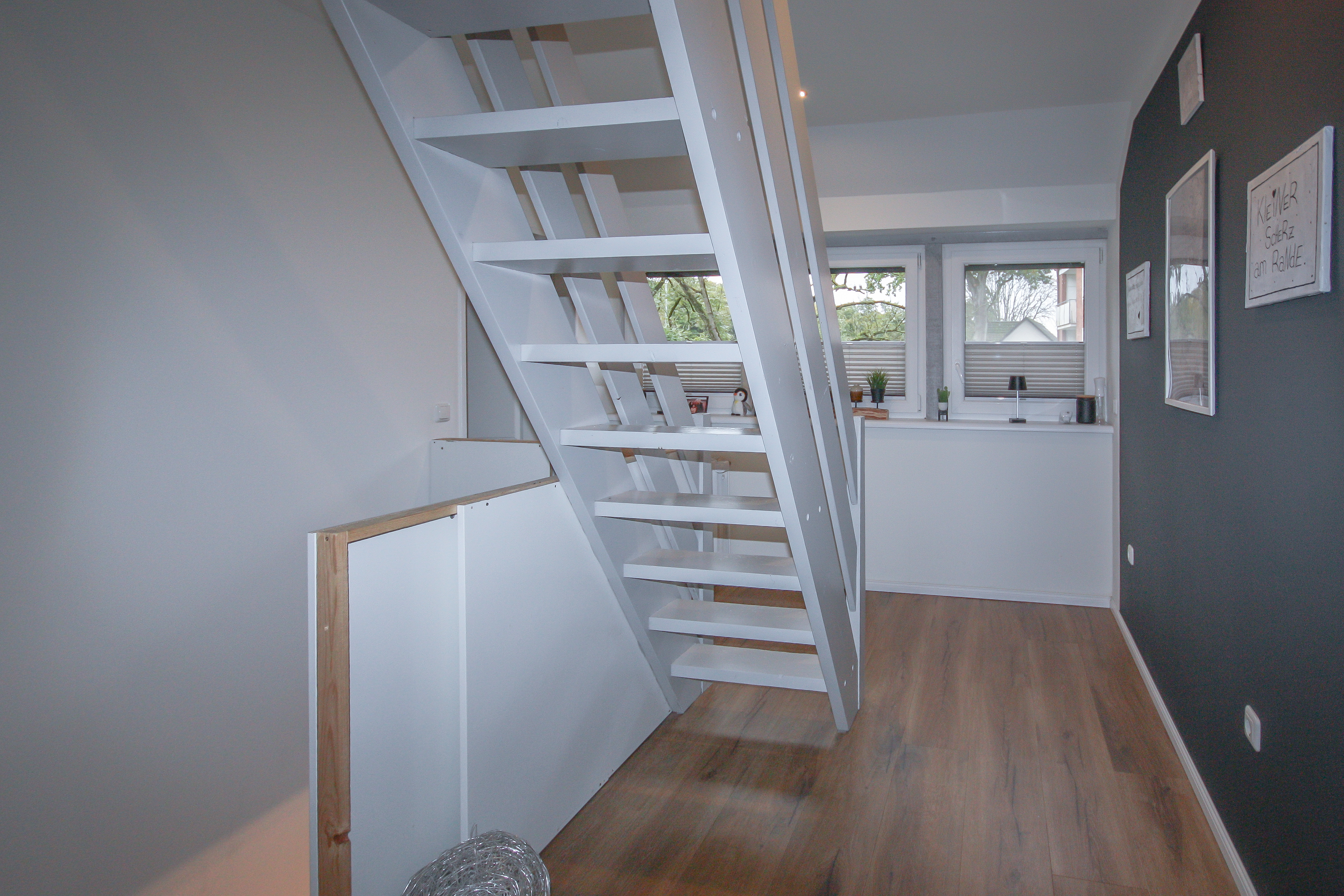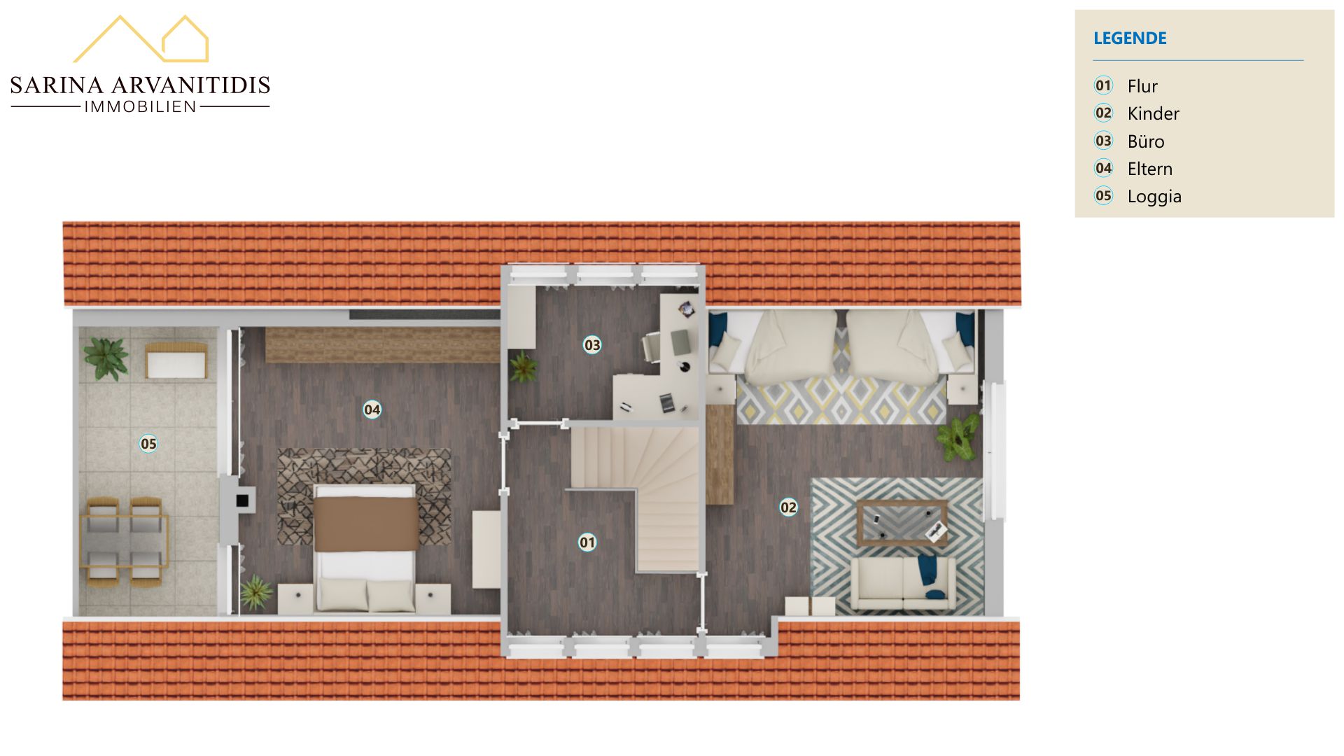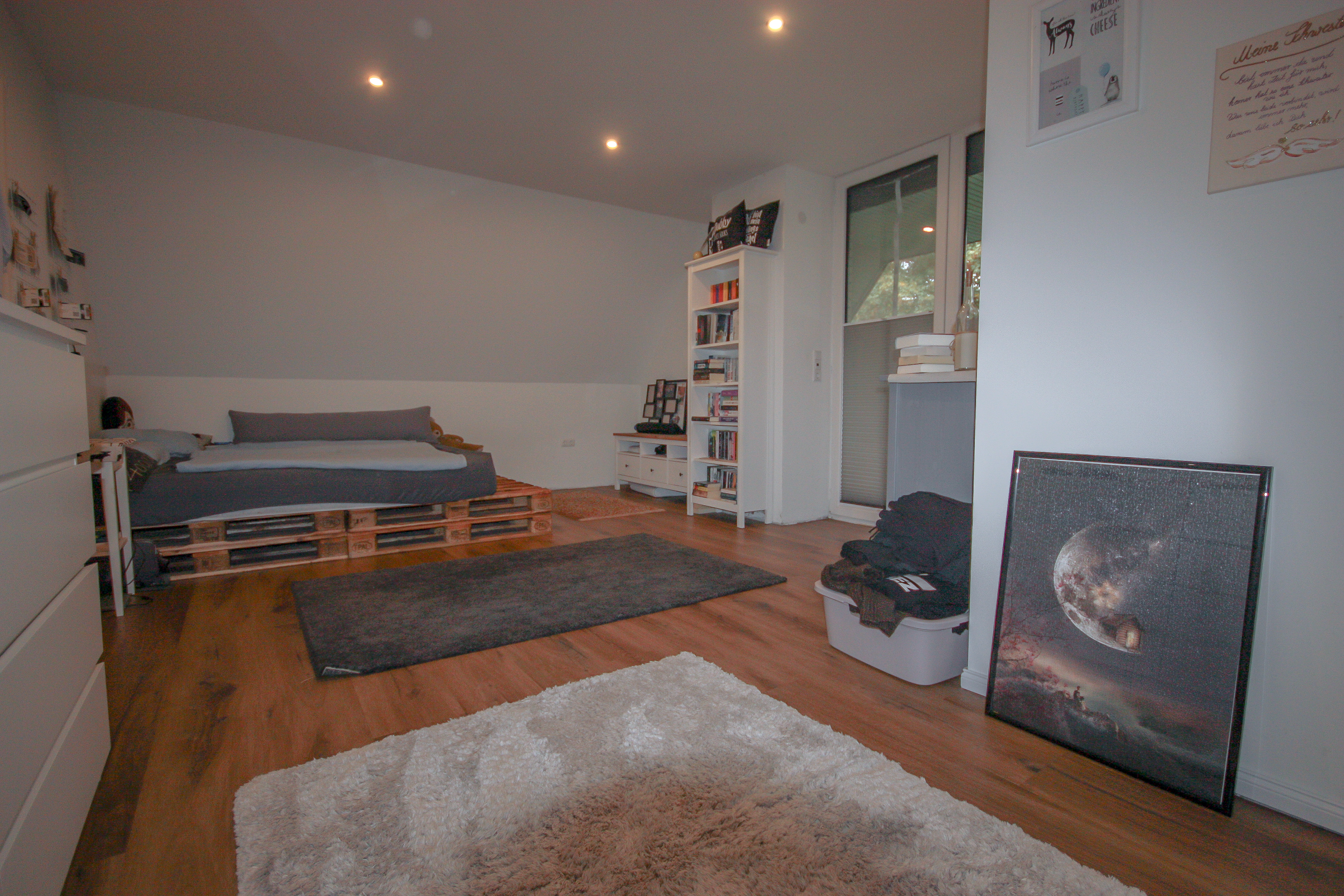 Eine stilvolle Betontreppe führt ins Obergeschoss. Hier erwartet Sie ein heller Flur, der Zugang zu einem großen, gemütlich geschnittenen Schlafzimmer bietet. Von hier aus gelangen Sie auch auf die geräumige Loggia, die einen herrlichen Blick ins Grüne eröffnet. Ein weiteres, besonders großzügiges Zimmer mit einer Fläche von rund 33 m² bietet vielfältige Nutzungsmöglichkeiten. Ob als Kinderzimmer, Hobbyraum oder Elternbereich. Ein drittes Zimmer wird derzeit als Büro genutzt. In diesem Raum sind bereits Wasseranschlüsse vorhanden, sodass dieser Bereich bei Bedarf problemlos in ein weiteres Badezimmer umfunktioniert werden kann.