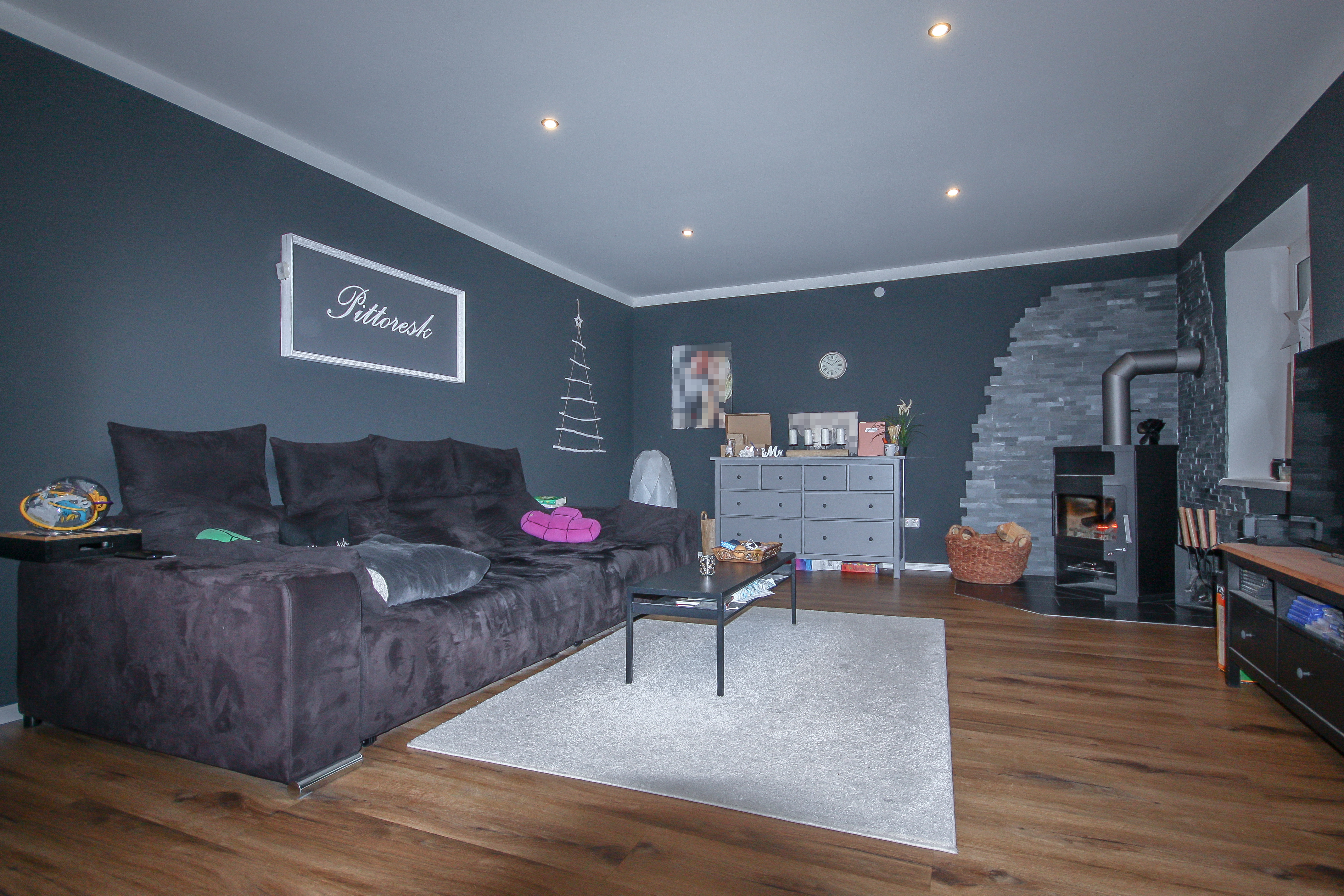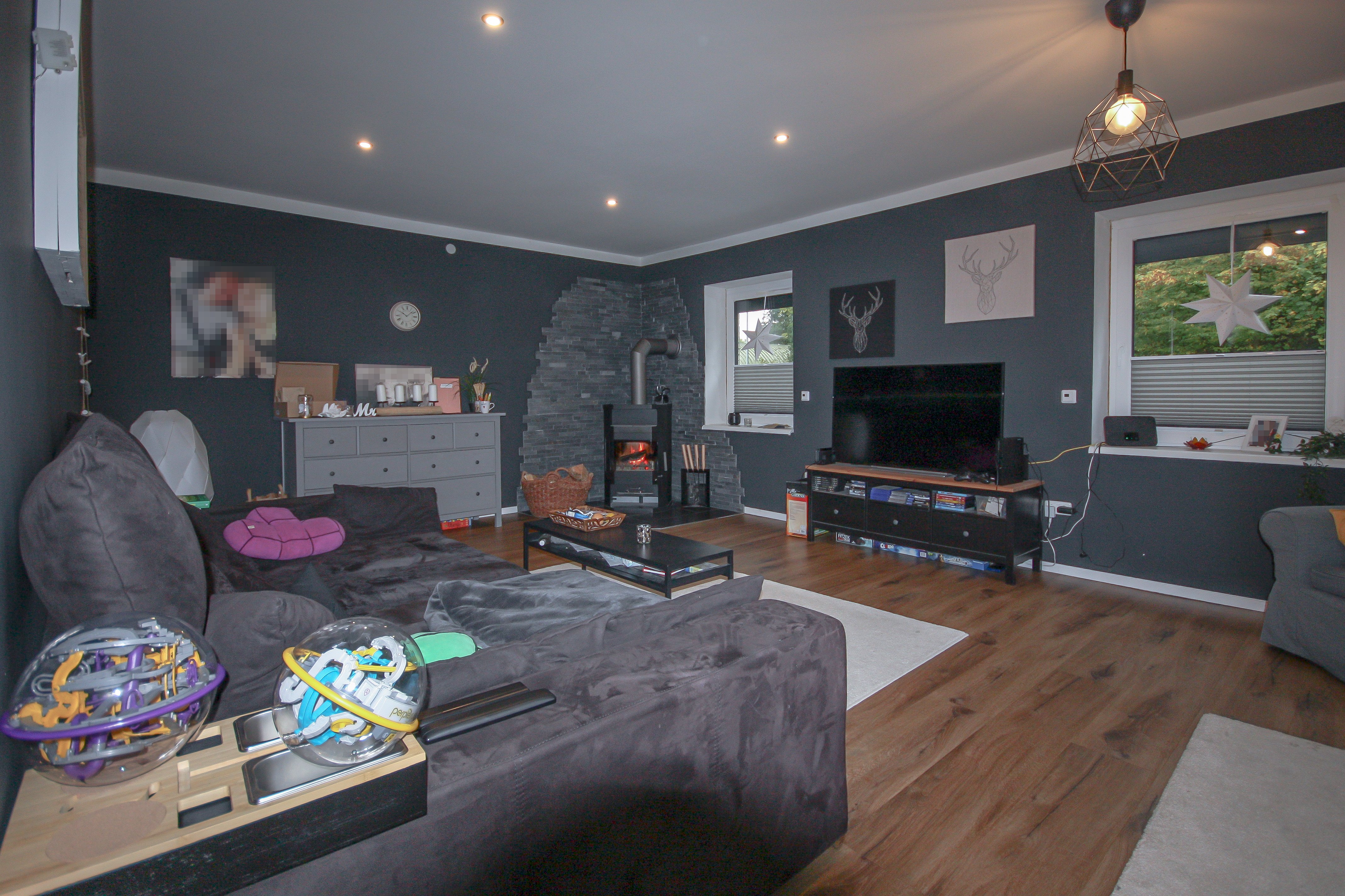 Rechts vom Eingangsbereich aus befindet sich das großzügig geschnittene Wohnzimmer. Der neuwertige Kamin sorgt hier für eine gemütliche Atmosphäre und macht diesen Raum zu einem echten Wohlfühlort. Das moderne und zeitlose Badezimmer im Erdgeschoss ist mit einer Dusche, einem Handtuchheizkörper, einer hochwertigen Spanndecke mit integrierten Spots, einer Fußbodenerwärmung sowie einem Fenster für natürliches Tageslicht ausgestattet und bietet ausreichend Platz für die ganze