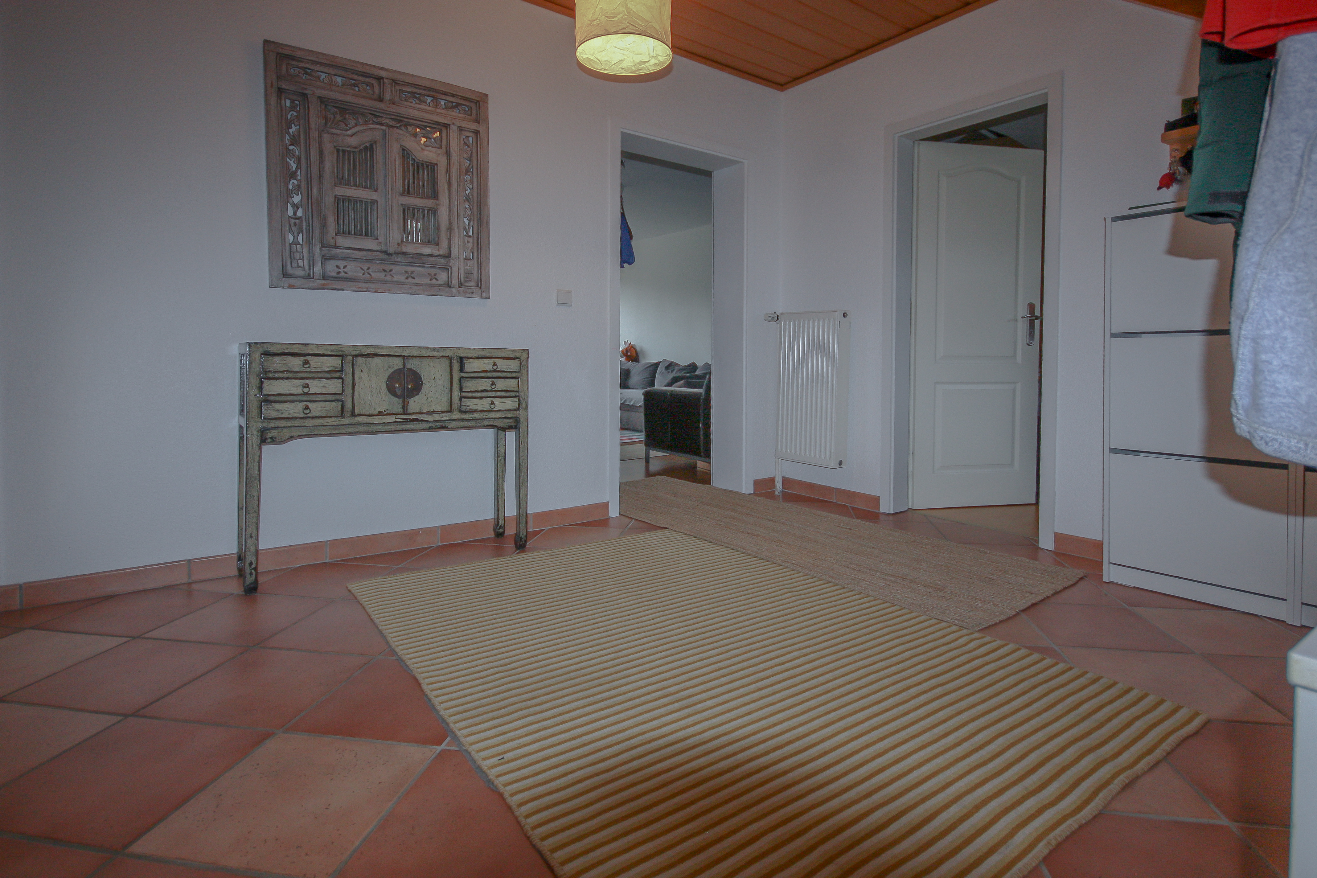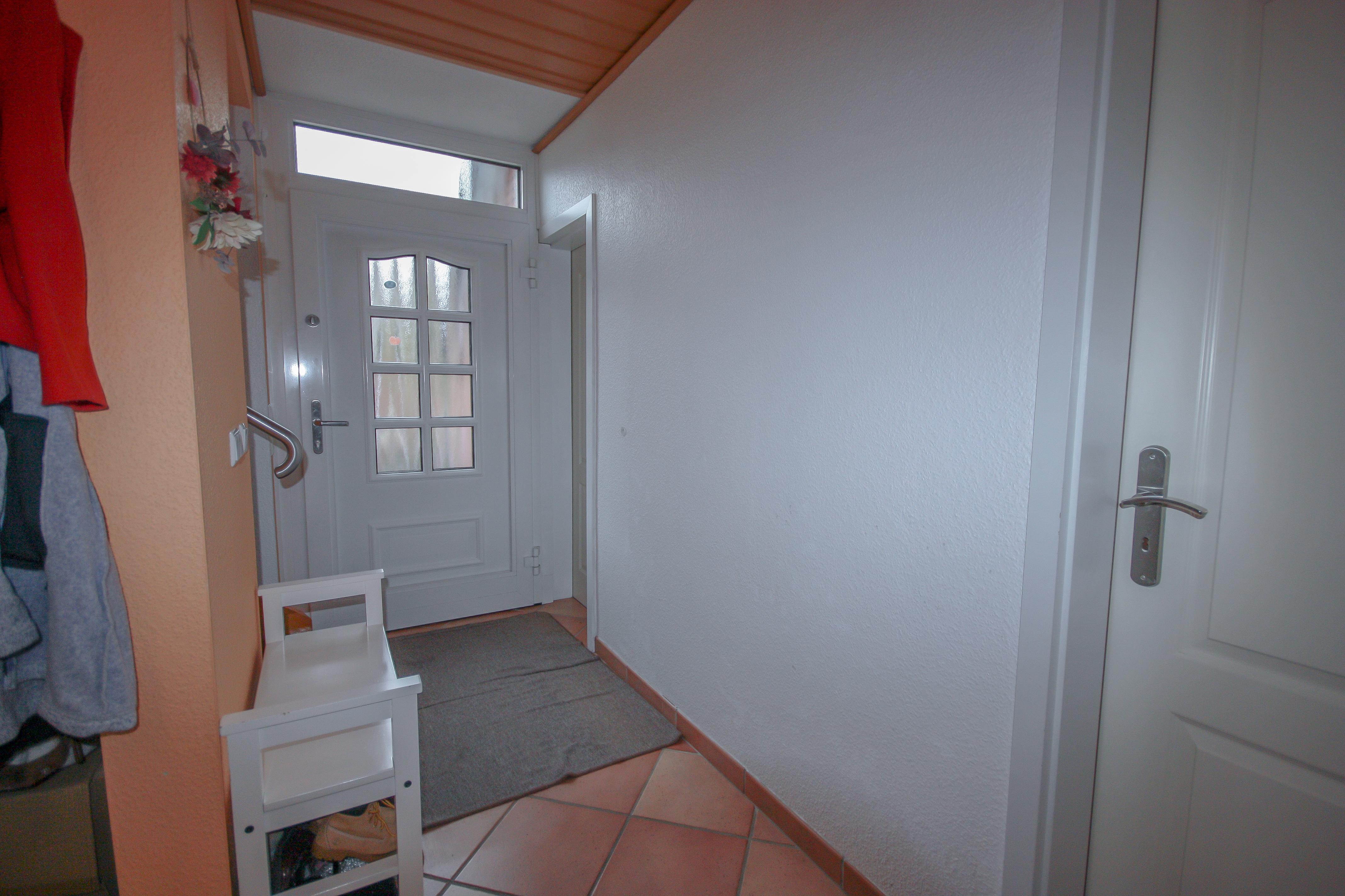 Beim Betreten des Hauses empfängt Sie ein großzügig und einladend gestalteter Flur, der durch seinen hervorragenden Schnitt viel Stellfläche für Garderobe und Möbel bietet. Vorne links vom Flur abgehend befindet sich ein unbeheizter Abstellraum, in dem die Gasheizung untergebracht ist und der sich hervorragend als zusätzlicher Stauraum eignet.