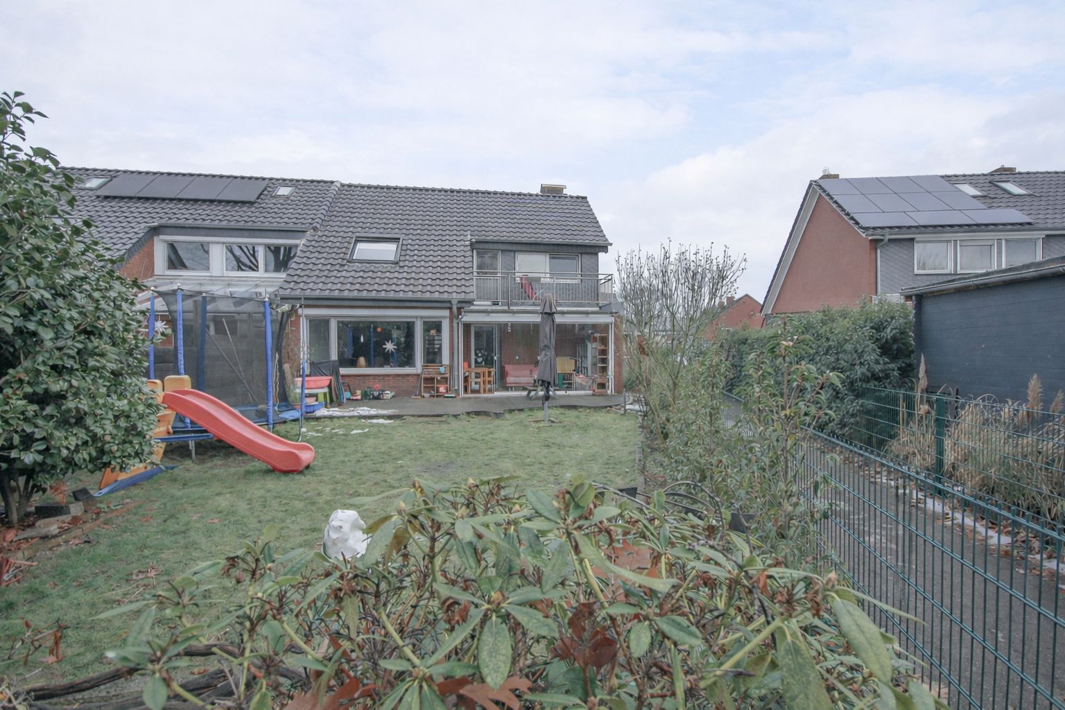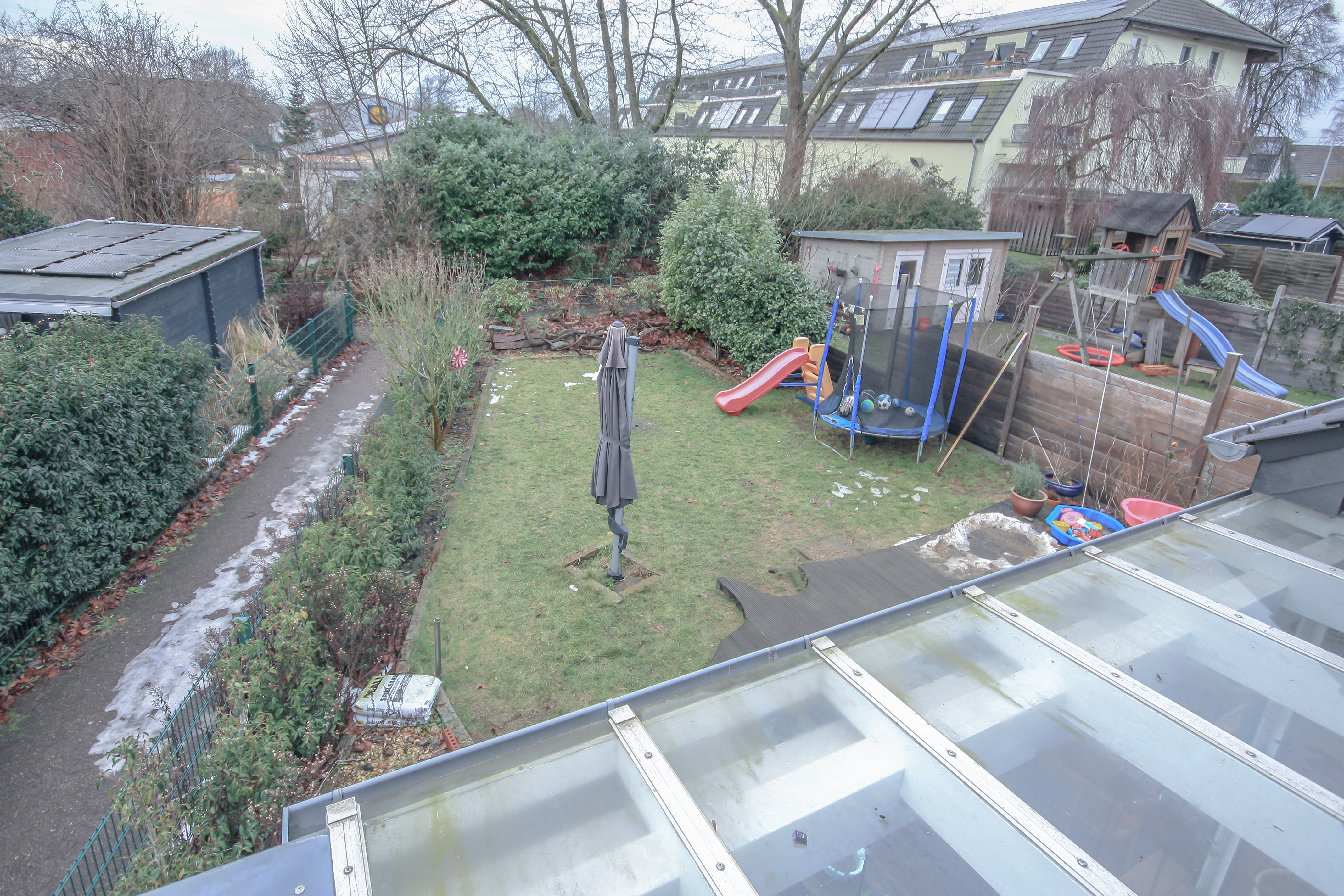 Die vorhandene Bepflanzung verleiht dem Außenbereich eine ansprechende, grüne Atmosphäre und sorgt für ein harmonisches Gesamtbild. Der Garten ist pflegeleicht angelegt und wird teilweise durch Hecken und Bäume eingefasst, wodurch in kurzer Zeit ein angenehmer Sichtschutz entsteht. Gleichzeitig bietet der Garten ausreichend Platz für Spielgeräte oder individuelle Nutzungsmöglichkeiten. Vor dem Haus steht ein praktischer Schuppen zur Verfügung, der viel Stauraum bietet. Zudem befindet sich der Sicherungskasten dort. Durch die Ecklage des Hauses ist es zudem möglich, um das Haus herumzugehen, was den Zugang und die Nutzung des Grundstücks besonders komfortabel macht.