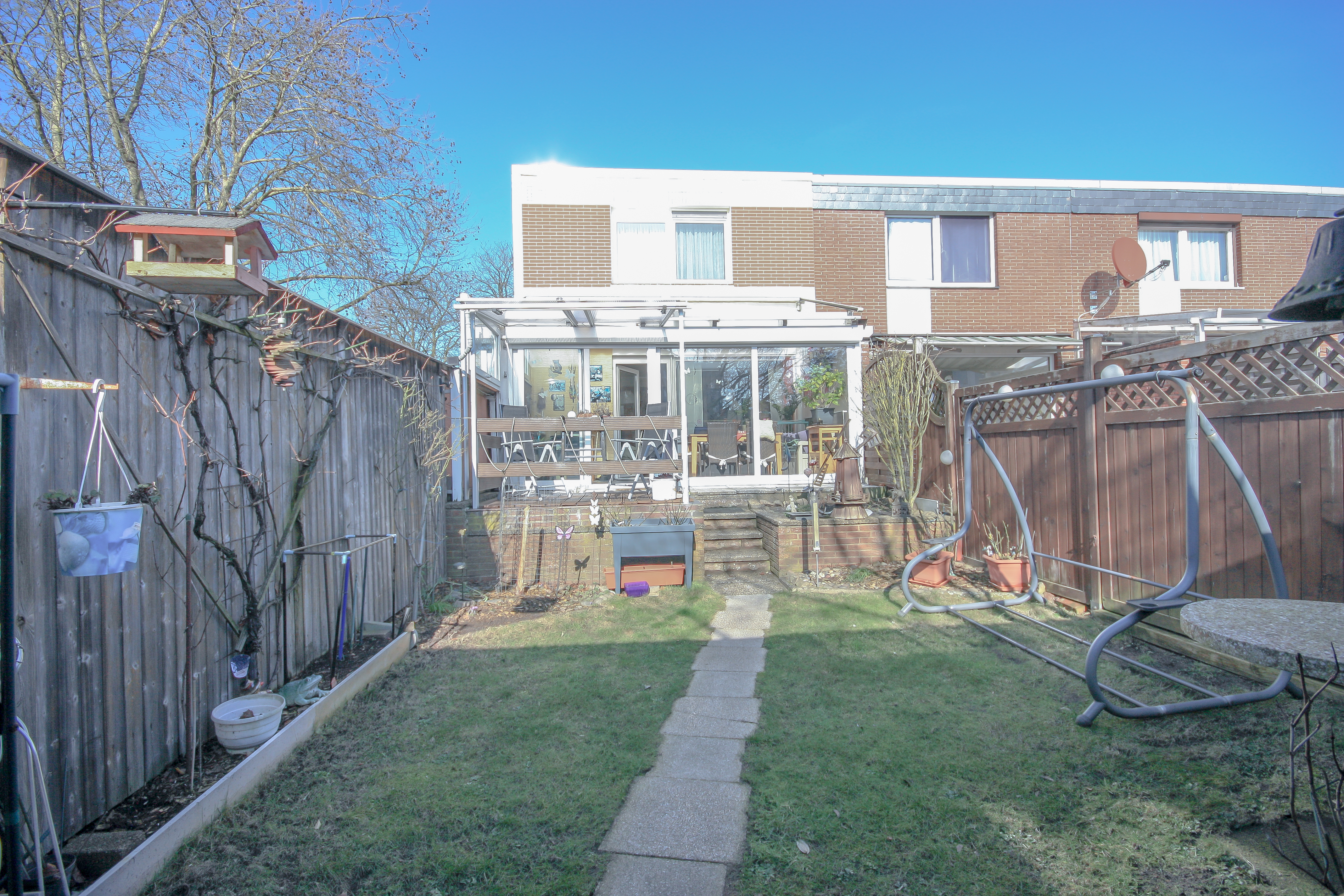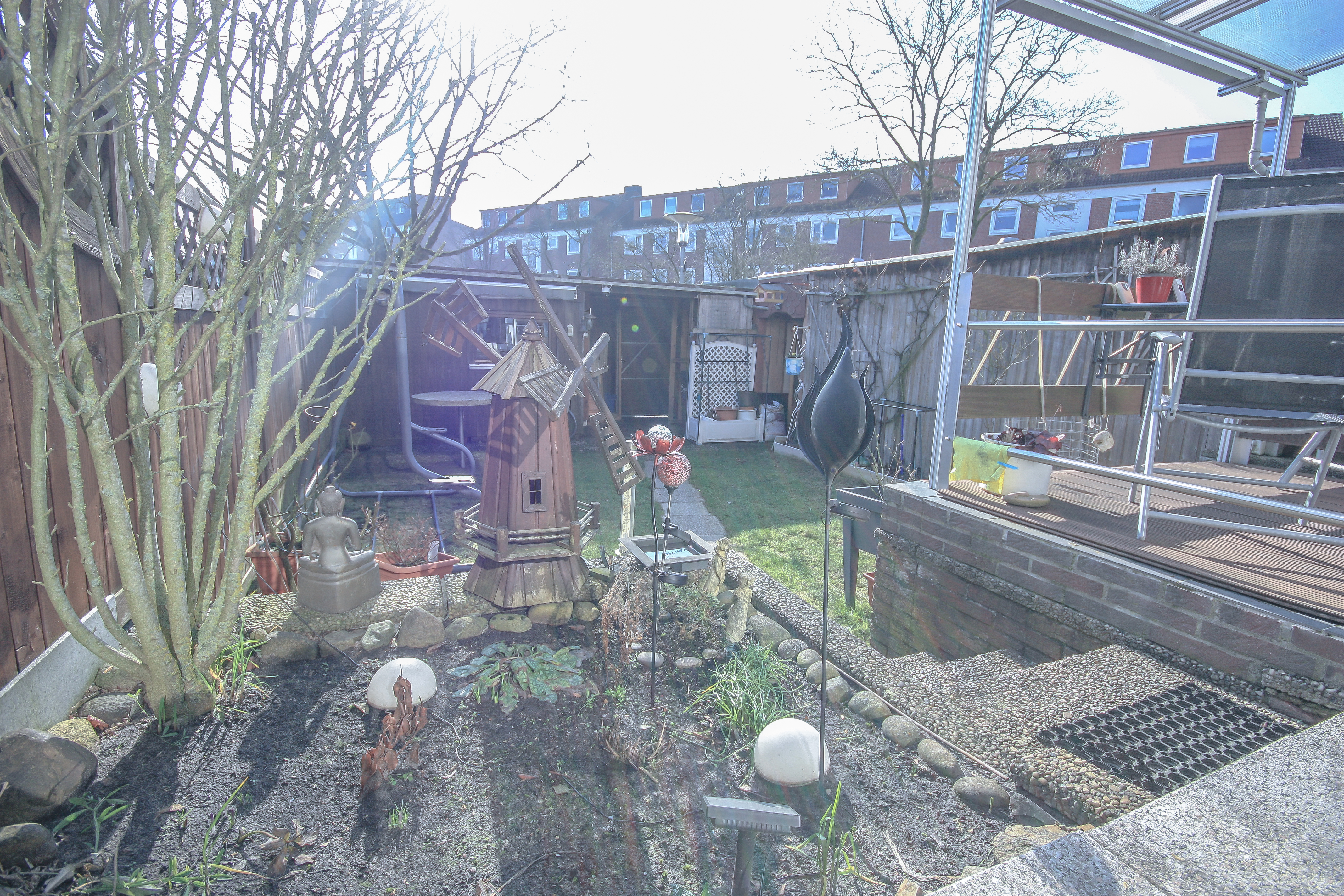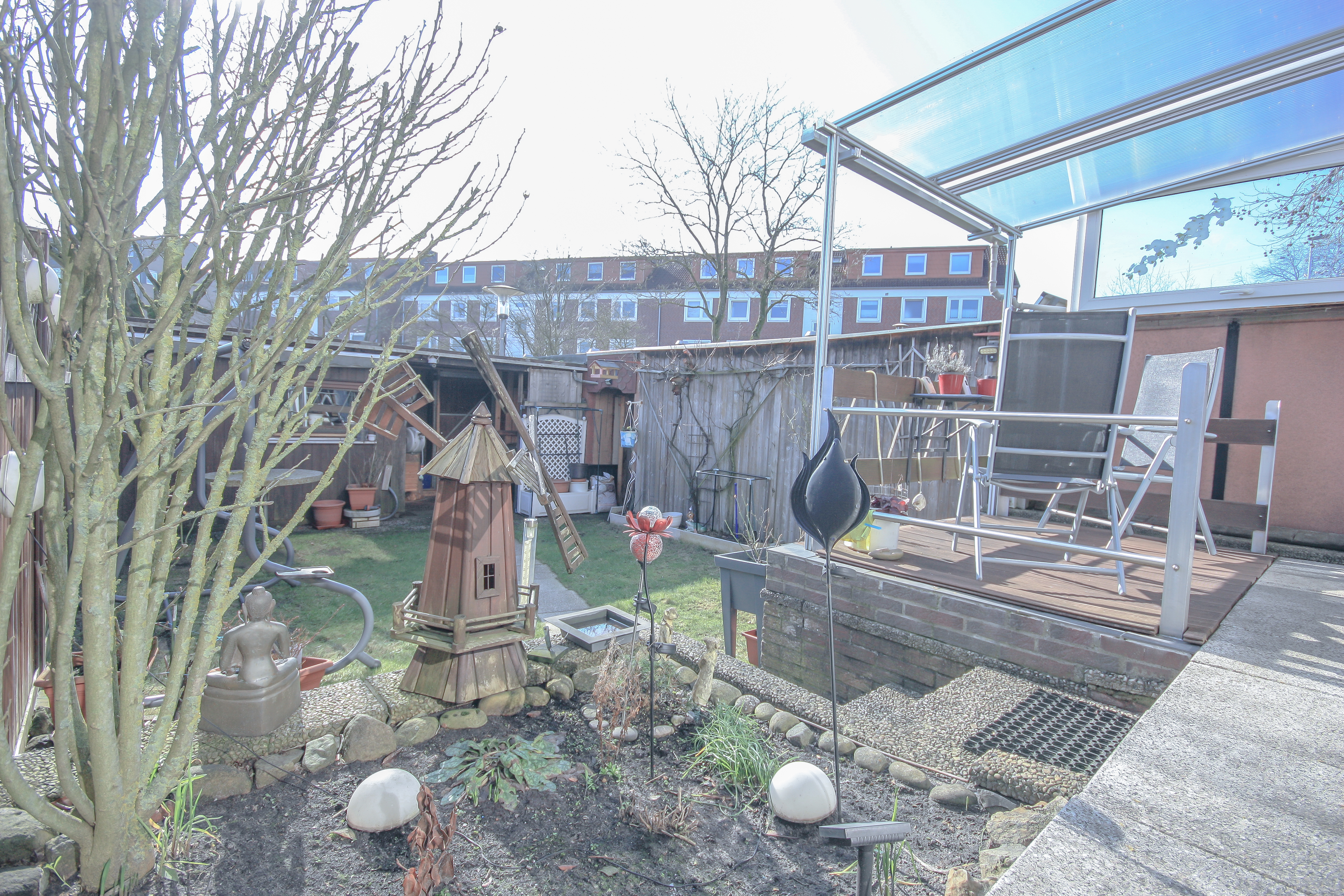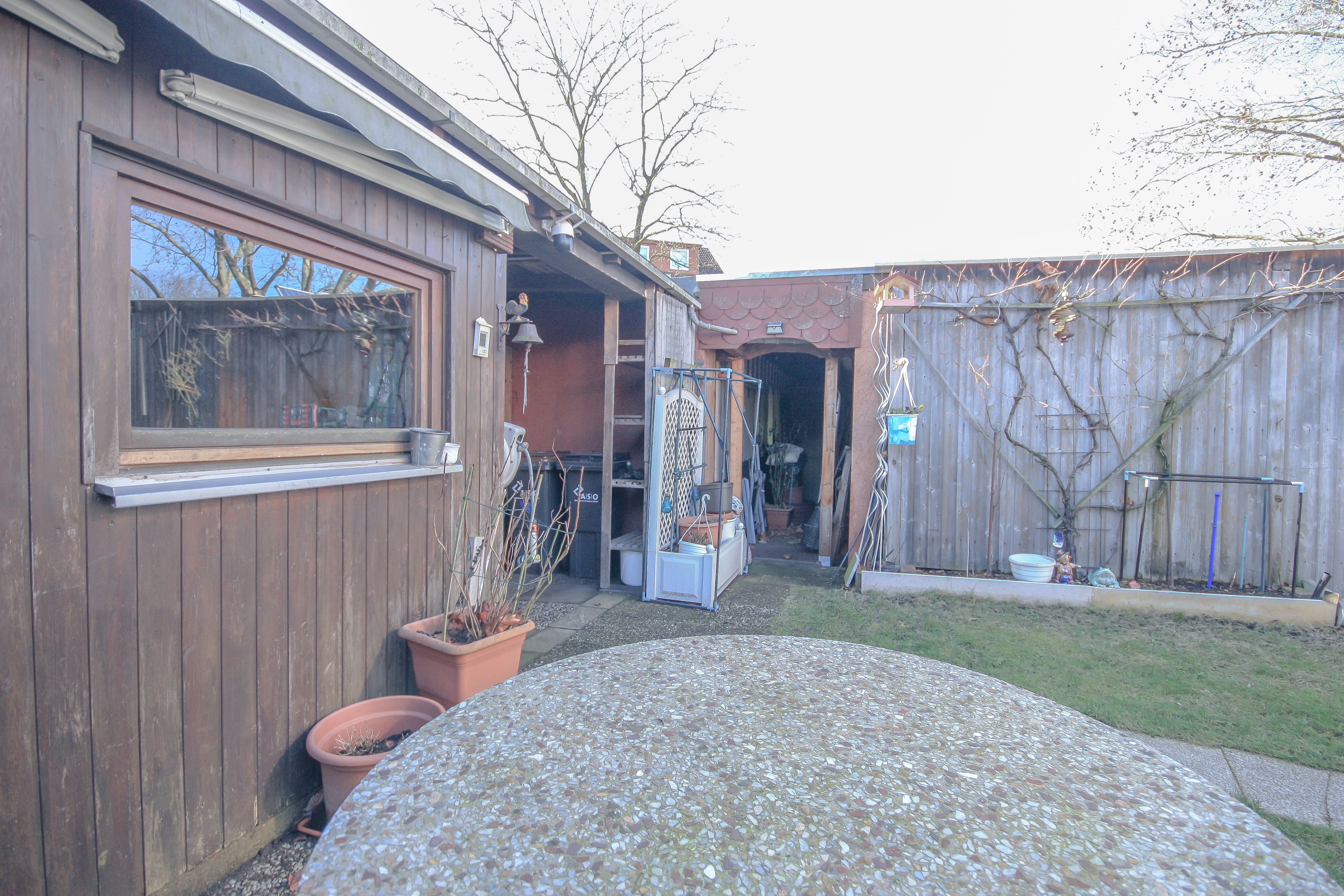 Vom Wohnzimmer aus erreichen Sie den beheizten Wintergarten, der ganzjährig als Wohnraumerweiterung genutzt werden kann und für viel Tageslicht sorgt. Angrenzend befindet sich eine kleine Holzterrasse, unter der ein Pool integriert ist. Ideal für entspannte Stunden im Sommer. Der Garten ist pflegeleicht angelegt und verfügt über einen großen Schuppen mit zusätzlichem Stauraum. Durch kleinere Umbaumaßnahmen ließe sich die nutzbare Gartenfläche bei Bedarf noch vergrößern.
