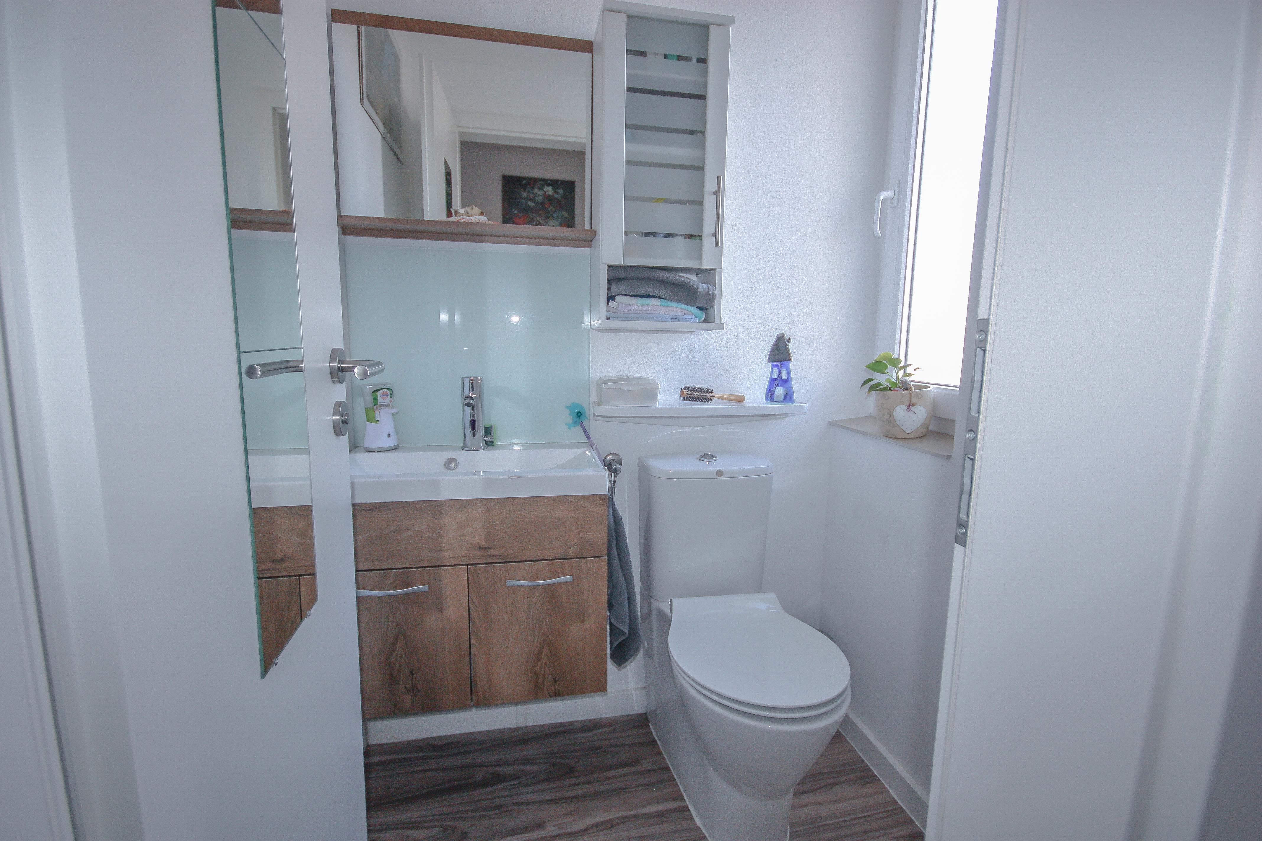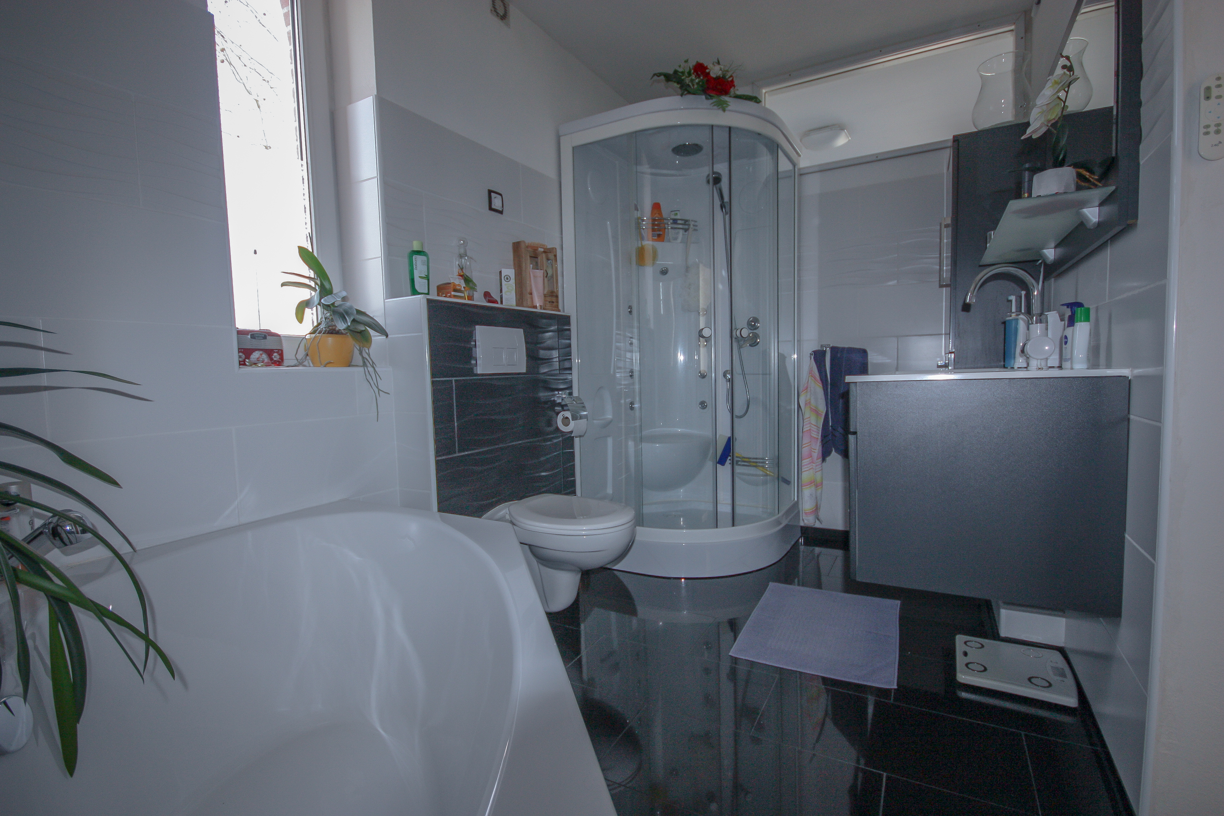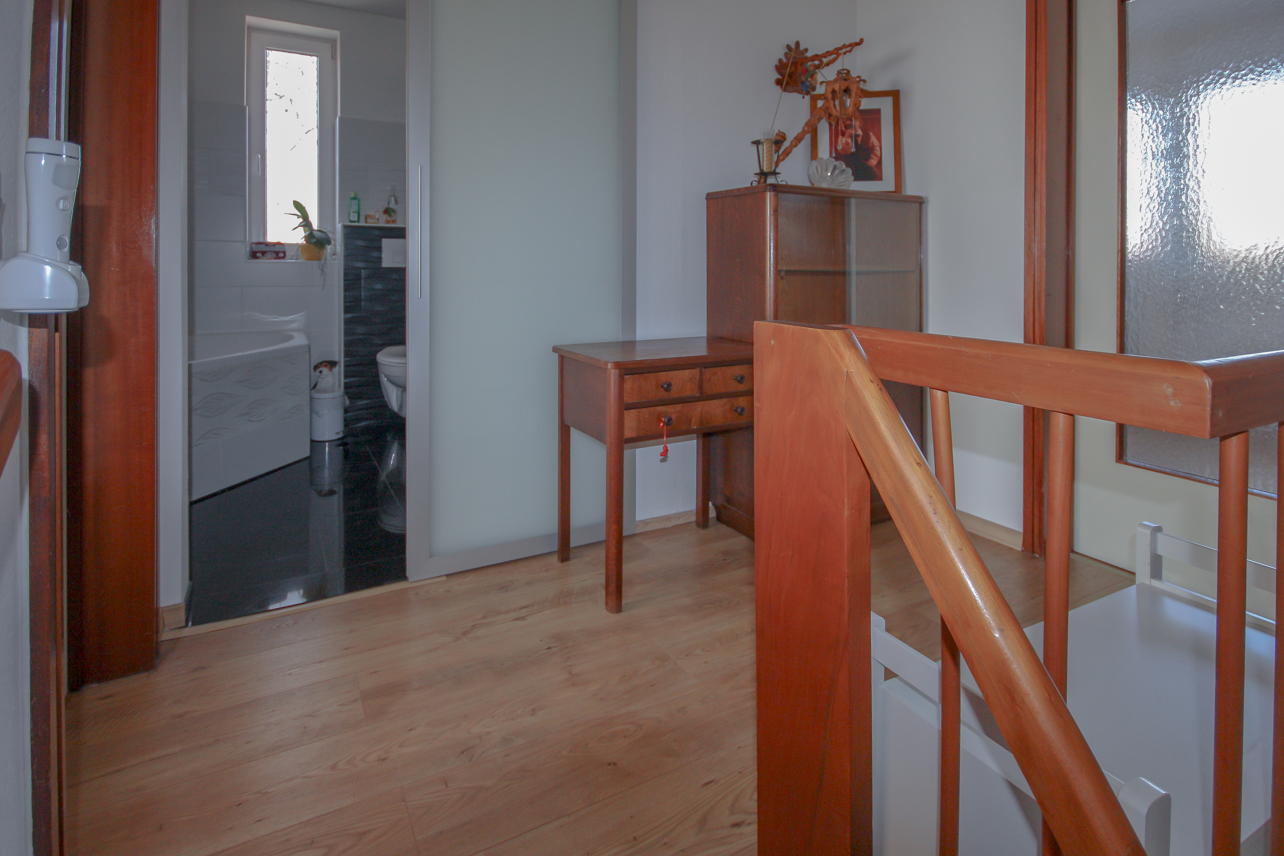 Im ersten Obergeschoss befindet sich ein im Jahr 2016 umfassend modernisiertes Tageslichtbad, das eine zeitgemäße Ausstattung und ein ansprechendes Ambiente vereint. Neben einer komfortablen Dusche steht eine Eckbadewanne für entspannte Stunden zur Verfügung. Ein stilvoller Waschtisch, ein WC sowie ein Handtuchheizkörper runden die Ausstattung ab.