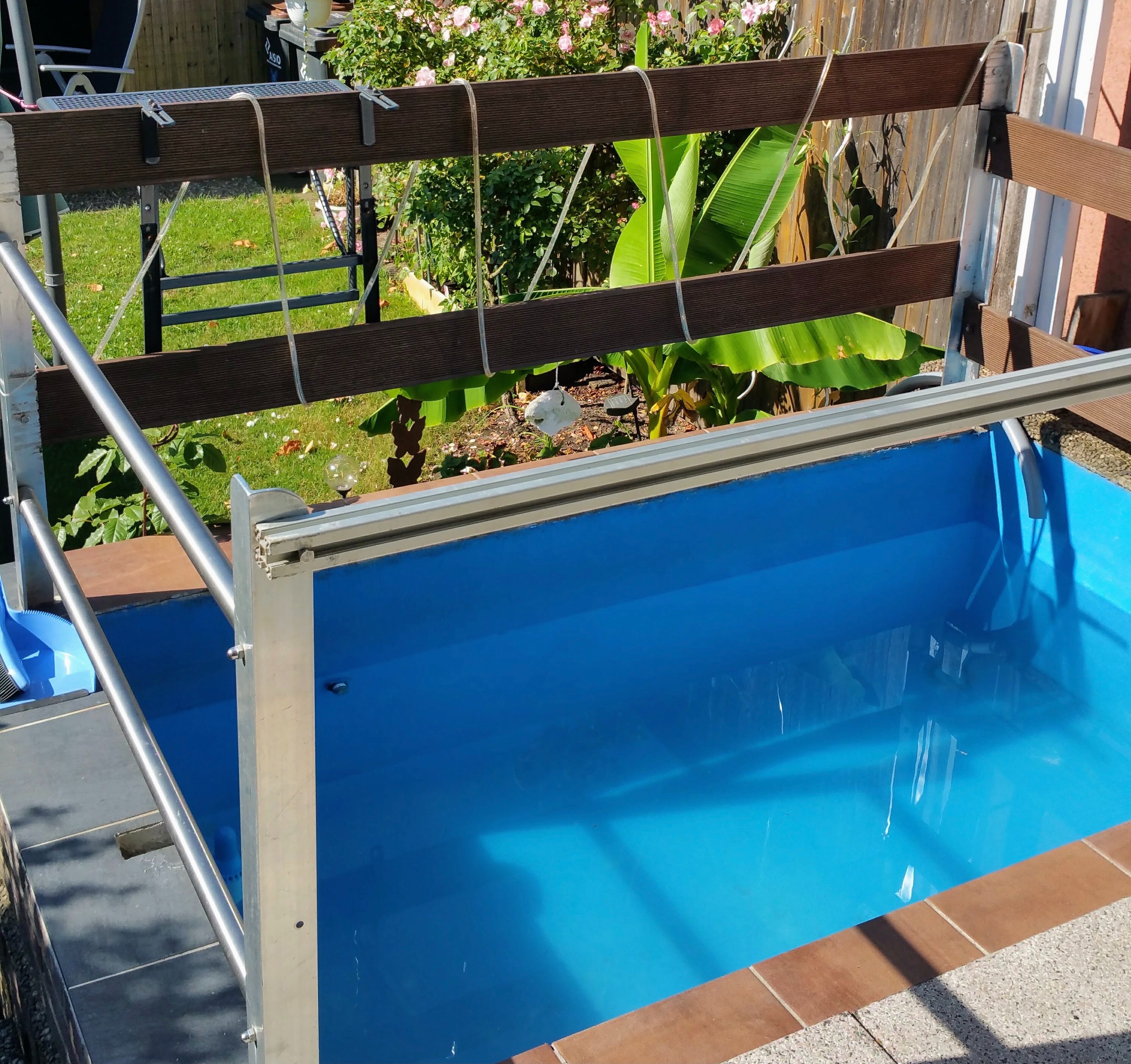 – kleine Holzterrasse mit darunterliegendem Pool