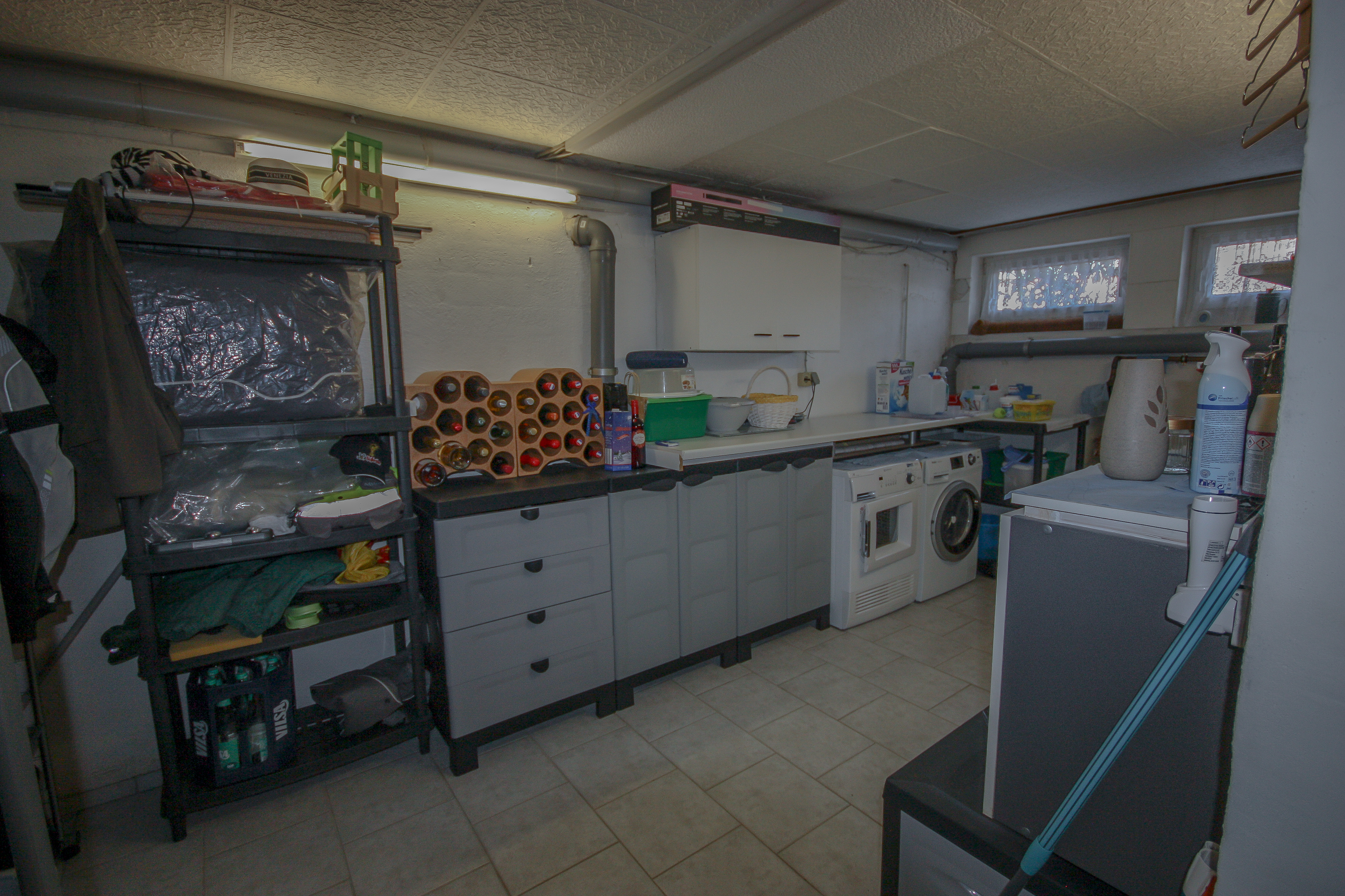 Ein besonderes Highlight ist der ca. 45 m² große Kellerbereich, der das Wohnraumangebot deutlich erweitert. Hier befindet sich ein hochwertig ausgestattetes Wellnessbadezimmer mit Dusche, Fußbodenheizung, großem Waschtisch, WC und Handtuchheizkörper. Ein weiterer Raum wurde vollständig zu Wohnzwecken ausgebaut und wird derzeit als Gästezimmer genutzt. Zusätzlich stehen ein großer Hauswirtschaftsraum mit Waschmaschinenanschluss und viel Platz für Vorräte sowie ein weiterer Abstellbereich unter der Treppe zur Verfügung.