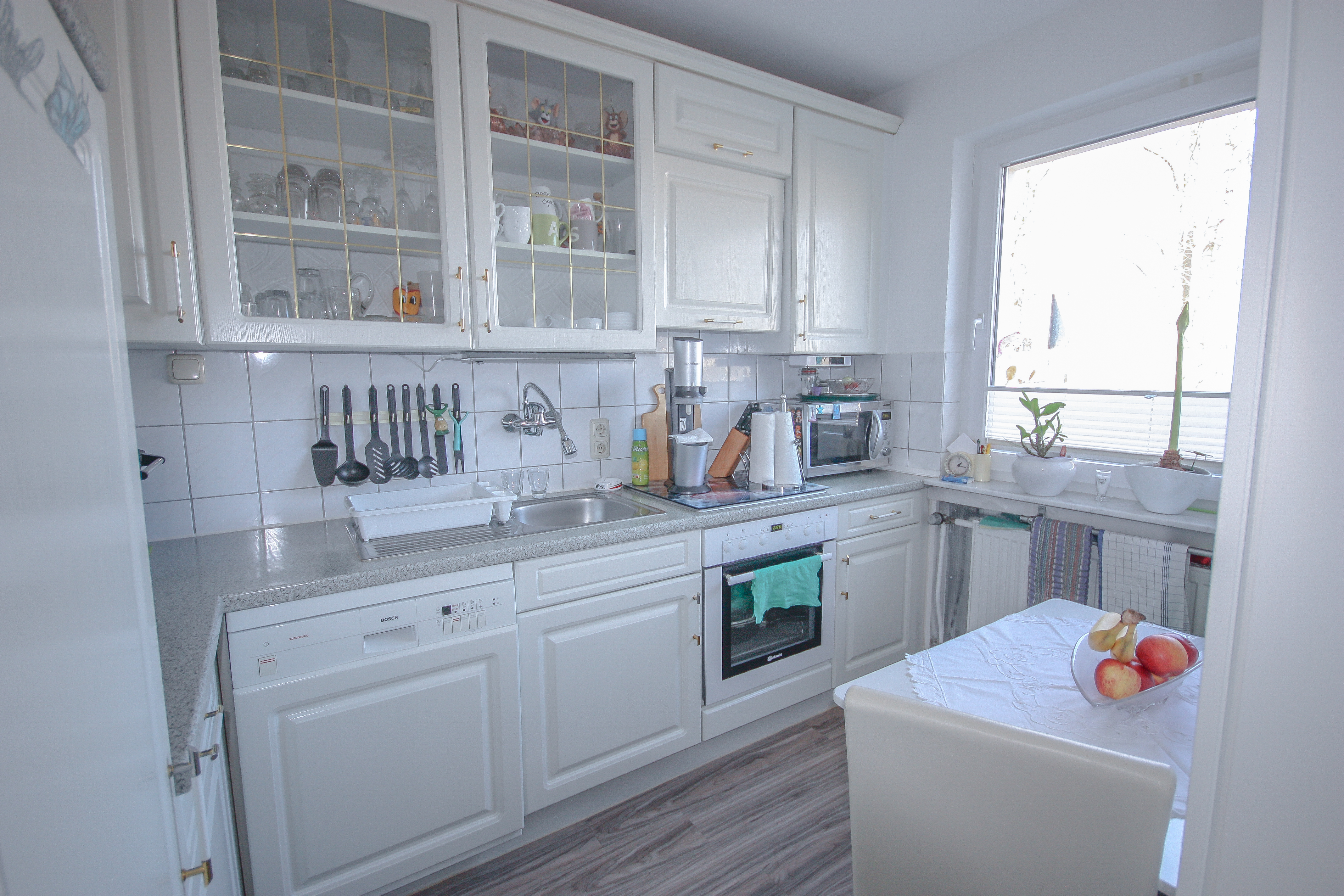 Die zeitlose Küche bietet ausreichend Arbeitsfläche und Stauraum. Eine praktische Durchreiche verbindet sie mit dem Essbereich. Zusätzlich ist genügend Platz für eine kleine Sitzgelegenheit vorhanden.
