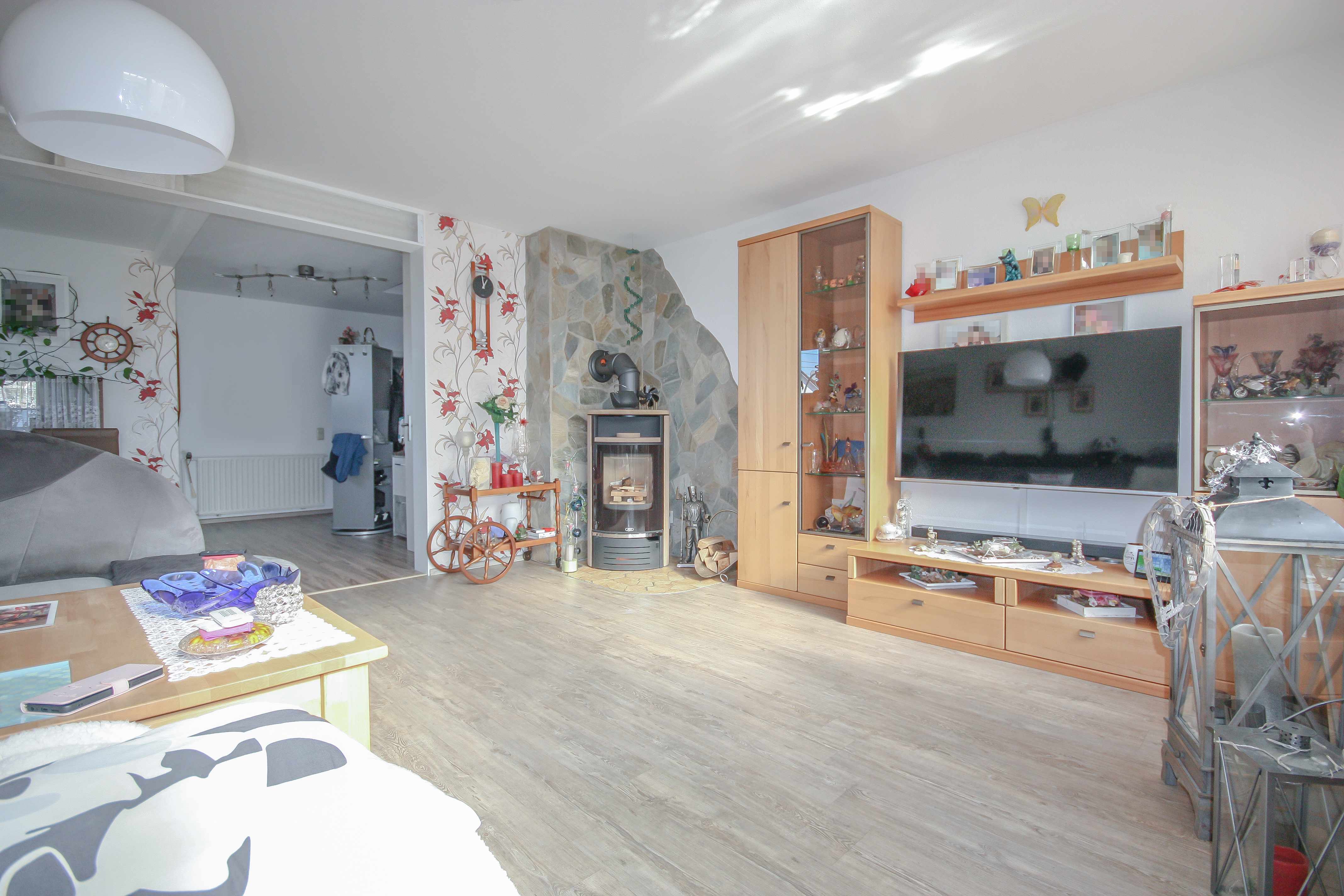 Im Eingangsbereich empfängt Sie ein kleiner Windfang mit angrenzendem Gäste-WC. Von hier aus gelangen Sie in den gut geschnittenen Wohn- und Essbereich, der sich ideal in einen gemütlichen Wohn- und einen separaten Essbereich unterteilen lässt. Das Wohnzimmer verfügt zudem über einen Kamin, der an kühlen Tagen für eine besondere Gemütlichkeit sorgt und eine angenehme Wohnatmosphäre schafft.