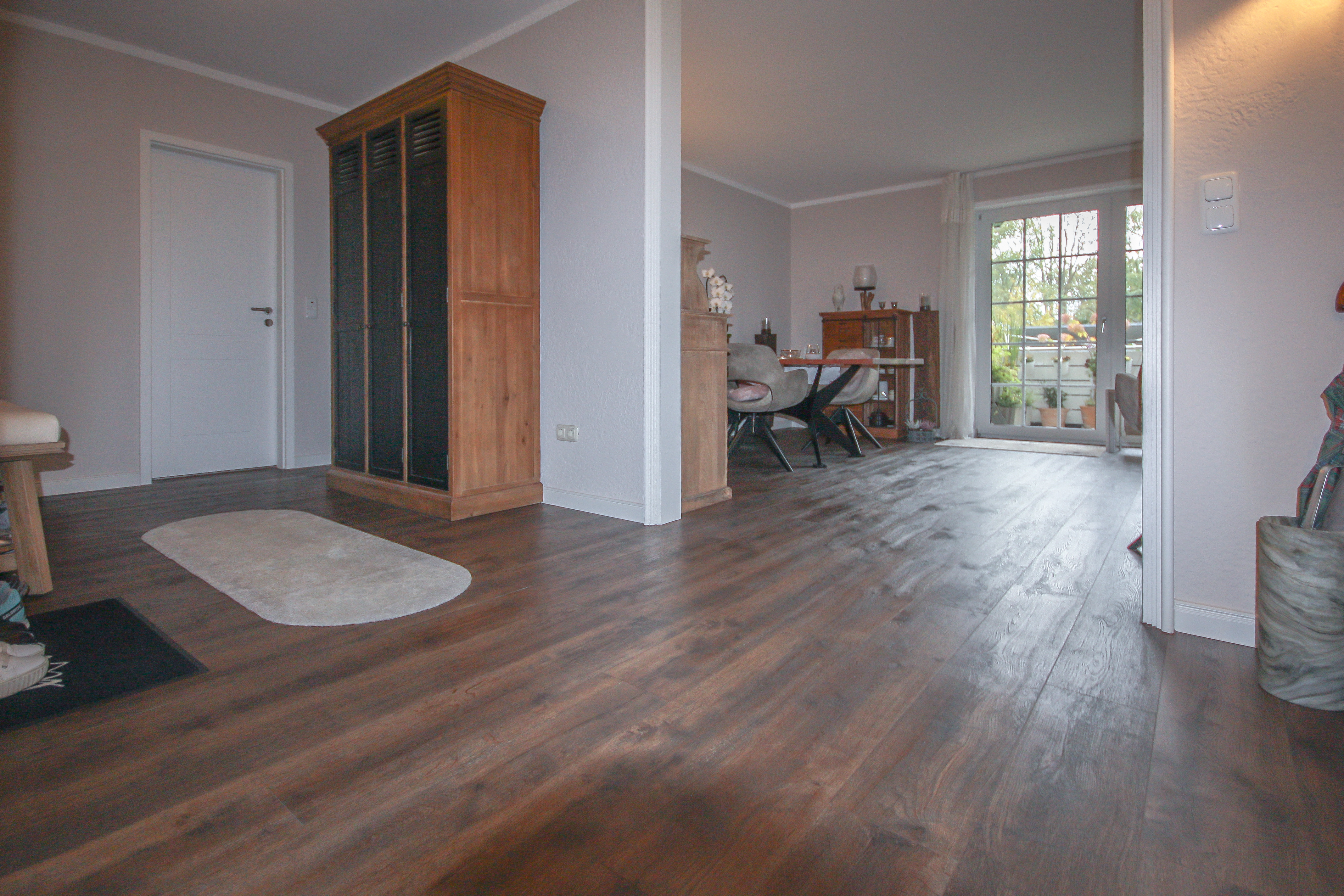 Beim Betreten der Wohnung werden Sie von einer großzügigen Diele empfangen, die viel Platz für eine Garderobe und weitere Aufbewahrungsmöglichkeiten bietet und den hervorragenden Schnitt der Wohnung erahnen lässt.